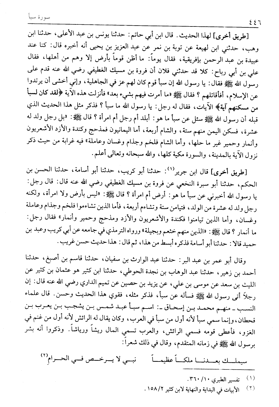 وَقَالَ أَبُو عُمَرَ بْنُ عَبْدِ الْبَرِّ: حَدَّثَنَا عَبْدُ الْوَارِثِ بْنُ سُفْيَانَ، حَدَّثَنَا قَاسِمُ بْنُ أَصْبَغَ، حَدَّثَنَا أَحْمَدُ بْنُ زُهَيْرٍ، حَدَّثَنَا عَبْدُ الْوَهَّابِ بْنُ نَجْدَةَ الْحَوْطِيُّ، حَدَّثَنَا ابْنُ كَثِيرٍ هُوَ عُثْمَانُ بْنُ كَثِيرٍ عَنِ اللَّيْثِ بْنِ سَعْدٍ عَنْ مُوسَى بْنِ عَلِيٍّ، عَنْ يَزِيدَ بن حصين عَنْ تَمِيمٍ الدَّارِيِّ رَضِيَ اللَّهُ عَنْهُ قَالَ: أَنَّ رَجُلًا أَتَى رَسُولَ اللَّهِ صَلَّى اللَّهُ عَلَيْهِ وَسَلَّمَ فَسَأَلَهُ عَنْ سَبَأٍ، فَذَكَرَ مِثْلَهُ، فَقَوِيَ هَذَا الْحَدِيثُ وَحُسِّنَ. قَالَ عُلَمَاءُ النَّسَبِ- مِنْهُمْ مُحَمَّدُ بْنُ إِسْحَاقَ-: اسْمُ سَبَأٍ عَبْدُ شَمْسِ بْنُ يَشْجُبَ بْنِ يَعْرُبَ بْنِ قَحْطَانَ، وَإِنَّمَا سُمِّيَ سَبَأً لِأَنَّهُ أَوَّلُ مَنْ سَبَأَ فِي الْعَرَبِ، وَكَانَ يُقَالُ لَهُ الرَّائِشُ لِأَنَّهُ أَوَّلُ مَنْ غَنِمَ فِي الْغَزْوِ، فَأَعْطَى قَوْمَهُ فَسُمِّي الرَّائِشَ، وَالْعَرَبُ تُسَمِّي الْمَالَ رِيشًا وَرِيَاشًا. وَذَكَرُوا أَنَّهُ بُشِّرَ بِرَسُولِ اللَّهِ صَلَّى اللَّهُ عَلَيْهِ وَسَلَّمَ فِي زَمَانِهِ الْمُتَقَدِّمِ، وَقَالَ فِي ذَلِكَ شِعْرًا: