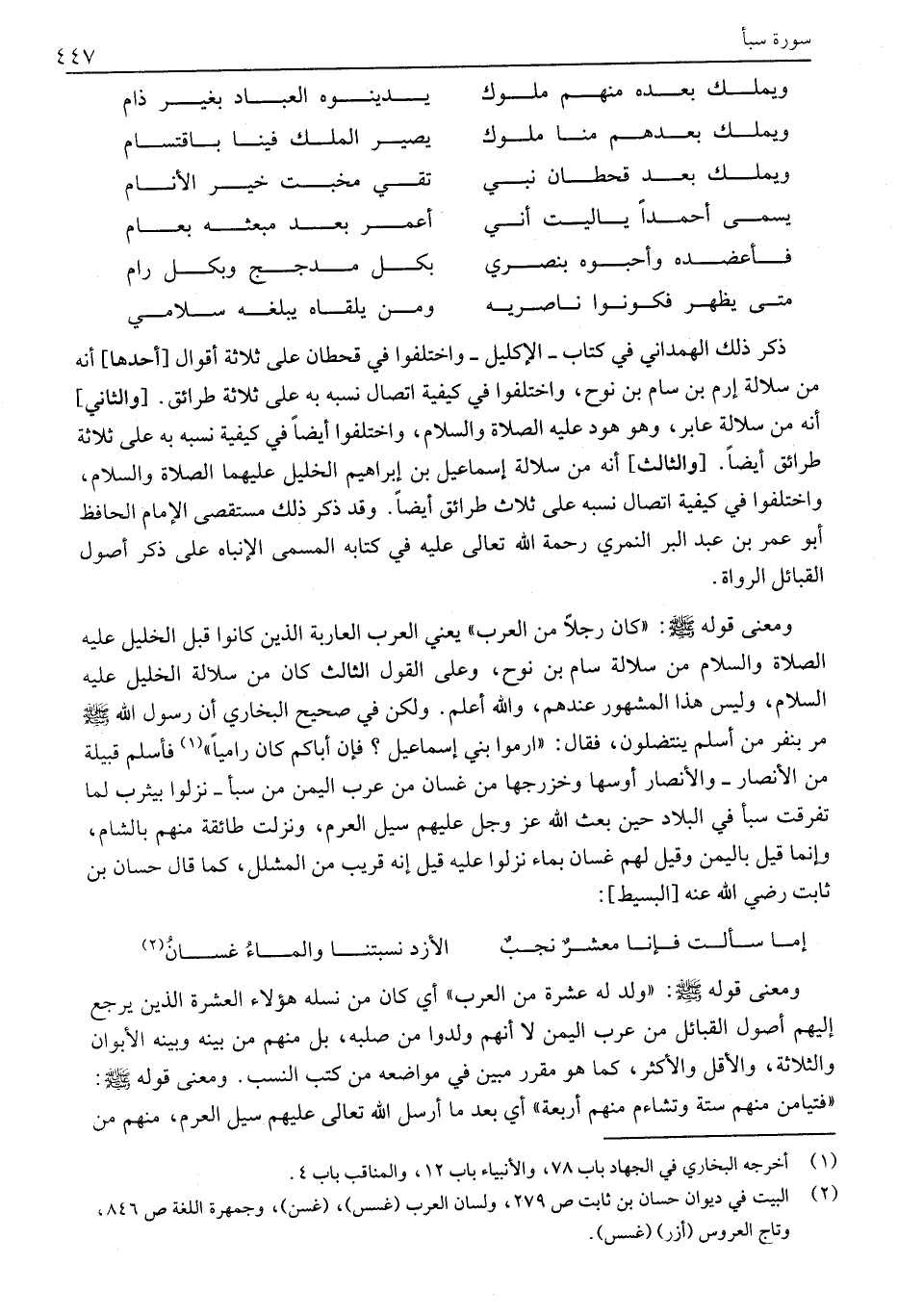 ومعنى قوله صلى الله عليه وسلم: «كَانَ رَجُلًا مِنَ الْعَرَبِ» يَعْنِي الْعَرَبُ الْعَارِبَةُ الذين كانوا قبل الخليل عليه الصلاة والسلام مِنْ سُلَالَةِ سَامِ بْنِ نُوحٍ، وَعَلَى الْقَوْلِ الثَّالِثِ كَانَ مِنْ سُلَالَةِ الْخَلِيلِ عَلَيْهِ السَّلَامُ، وليس هذا المشهور عِنْدَهُمْ، وَاللَّهُ أَعْلَمُ. وَلَكِنْ فِي صَحِيحِ الْبُخَارِيِّ أَنَّ رَسُولَ اللَّهِ صَلَّى اللَّهُ عليه وسلم مَرَّ بِنَفَرٍ مِنْ أَسْلَمَ يَنْتَضِلُونَ، فَقَالَ: «ارْمُوا بَنِي إِسْمَاعِيلَ؟ فَإِنَّ أَبَاكُمْ كَانَ رَامِيًا» «1» فَأَسْلَمُ قَبِيلَةٌ مِنَ الْأَنْصَارِ- وَالْأَنْصَارُ أَوْسُهَا وَخَزْرَجُهَا مِنْ غَسَّانَ مِنْ عَرَبِ الْيَمَنِ مِنْ سَبَأٍ- نَزَلُوا بِيَثْرِبَ لَمَّا تَفَرَّقَتْ سَبَأٌ فِي الْبِلَادِ حِينَ بعث الله عز وجل عليهم سيل العرم، ونزلت طائقة منهم بالشام، وإنما قيل باليمن وقيل لهم غسان بماء نزلوا عليه قيل إِنَّهُ قَرِيبٌ مِنَ الْمُشَلَّلِ، كَمَا قَالَ حَسَّانُ بن ثابت رضي الله عنه [البسيط] :