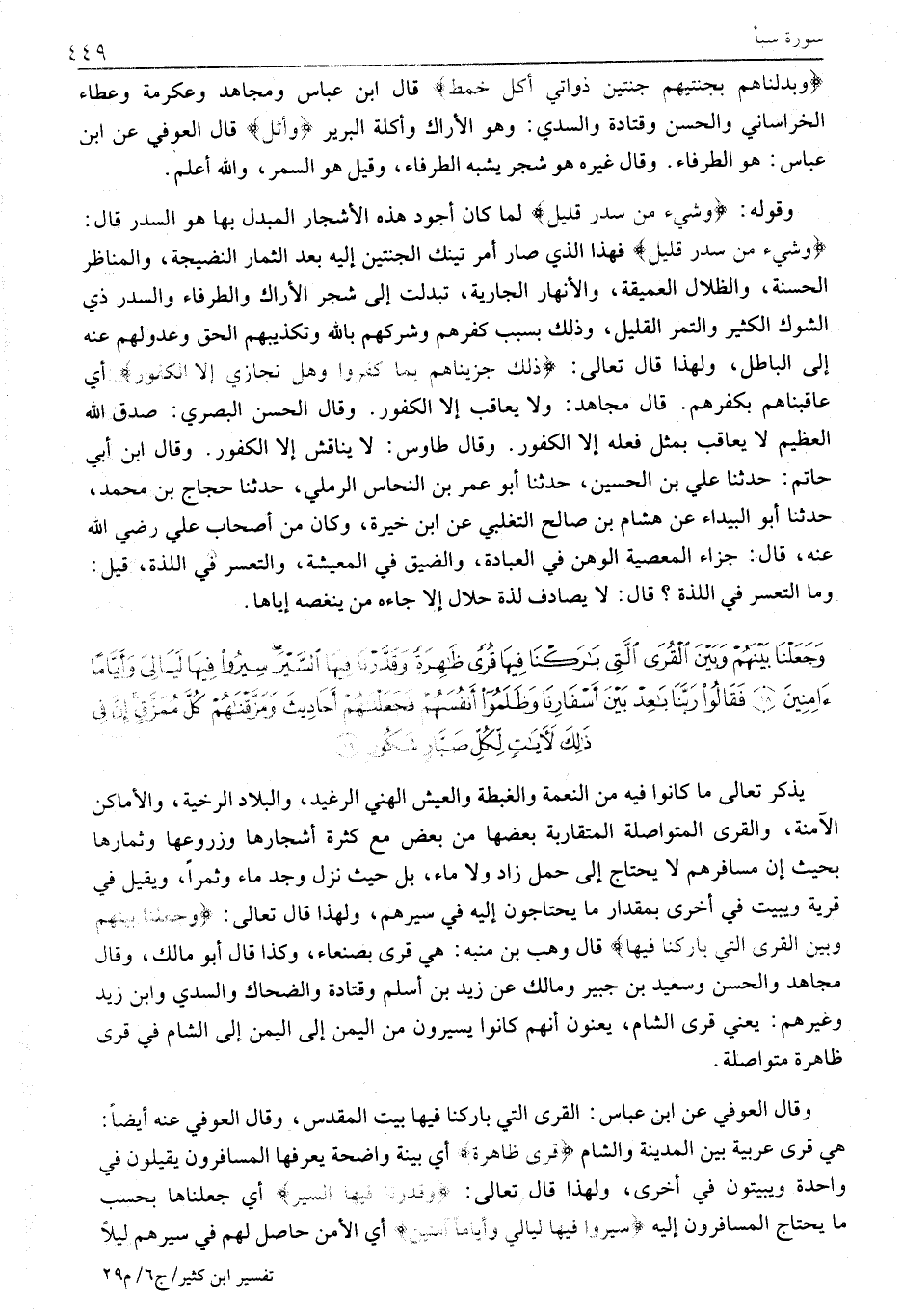 وَشَيْءٍ مِنْ سِدْرٍ قَلِيلٍ فَهَذَا الَّذِي صَارَ أَمْرُ تَيْنِكَ الْجَنَّتَيْنِ إِلَيْهِ بَعْدَ الثِّمَارِ النَّضِيجَةِ، وَالْمَنَاظِرِ الْحَسَنَةِ، وَالظِّلَالِ الْعَمِيقَةِ، وَالْأَنْهَارِ الْجَارِيَةِ، تَبَدَّلَتْ إِلَى شَجَرِ الْأَرَاكِ وَالطَّرْفَاءِ وَالسِّدْرِ ذي الشوك الكثير والتمر الْقَلِيلِ، وَذَلِكَ بِسَبَبِ كُفْرِهِمْ وَشِرْكِهِمْ بِاللَّهِ وَتَكْذِيبِهِمُ الْحَقَّ وَعُدُولِهِمْ عَنْهُ إِلَى الْبَاطِلِ، وَلِهَذَا قَالَ تعالى: ذلِكَ جَزَيْناهُمْ بِما كَفَرُوا وَهَلْ نُجازِي إِلَّا الْكَفُورَ أَيْ عَاقَبْنَاهُمْ بِكُفْرِهِمْ. قَالَ مُجَاهِدٌ: وَلَا يُعَاقَبُ إِلَّا الْكُفُورُ. وَقَالَ الْحَسَنُ الْبَصْرِيُّ: صَدَقَ اللَّهُ الْعَظِيمُ لَا يُعَاقَبُ بِمِثْلِ فِعْلِهِ إِلَّا الْكُفُورُ. وَقَالَ طَاوُسٌ: لَا يُنَاقَشُ إِلَّا الْكُفُورُ. وَقَالَ ابْنُ أَبِي حَاتِمٍ: حَدَّثَنَا عَلِيُّ بْنُ الْحُسَيْنِ، حَدَّثَنَا أَبُو عُمَرَ بْنُ النَّحَّاسِ الرَّمْلِيُّ، حَدَّثَنَا حَجَّاجُ بْنُ مُحَمَّدٍ، حَدَّثَنَا أَبُو الْبَيْدَاءِ عَنْ هِشَامِ بْنِ صَالِحٍ التَّغْلِبِيِّ عَنِ ابْنِ خِيرَةَ، وَكَانَ مِنْ أَصْحَابِ عَلِيٍّ رَضِيَ اللَّهُ عَنْهُ، قَالَ: جَزَاءُ الْمَعْصِيَةِ الْوَهْنُ فِي الْعِبَادَةِ، وَالضِّيقُ فِي الْمَعِيشَةِ، وَالتَّعَسُّرُ فِي اللَّذَّةِ، قِيلَ:
