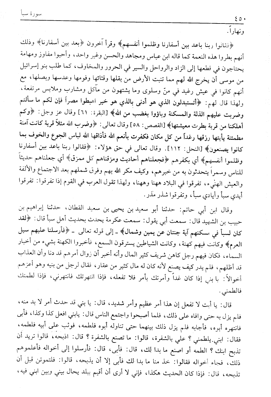 فَقالُوا رَبَّنا باعِدْ بَيْنَ أَسْفارِنا وَظَلَمُوا أَنْفُسَهُمْ وَقَرَأَ آخَرُونَ بَعِّدْ بَيْنِ أَسْفَارِنَا وَذَلِكَ أَنَّهُمْ بَطِرُوا هَذِهِ النِّعْمَةَ كَمَا قَالَهُ ابْنُ عَبَّاسٍ وَمُجَاهِدٌ وَالْحَسَنُ وَغَيْرُ وَاحِدٍ، وَأَحَبُّوا مَفَاوِزَ وَمَهَامِهَ يَحْتَاجُونَ فِي قَطْعِهَا إِلَى الزَّادِ وَالرَّوَاحِلِ وَالسَّيْرِ فِي الْحَرُورِ وَالْمَخَاوِفِ، كَمَا طَلَبَ بَنُو إِسْرَائِيلَ مِنْ مُوسَى أَنْ يُخْرِجَ اللَّهُ لَهُمْ مِمَّا تُنْبِتُ الْأَرْضُ مِنْ بَقْلِهَا وَقِثَّائِهَا وَفُومِهَا وَعَدَسِهَا وَبَصَلِهَا، مَعَ أَنَّهُمْ كَانُوا فِي عَيْشٍ رَغِيدٍ فِي مَنٍّ وَسَلْوَى وَمَا يَشْتَهُونَ مِنْ مَآكِلَ وَمَشَارِبَ وَمَلَابِسَ مُرْتَفِعَةٍ، وَلِهَذَا قَالَ لَهُمْ: أَتَسْتَبْدِلُونَ الَّذِي هُوَ أَدْنى بِالَّذِي هُوَ خَيْرٌ اهْبِطُوا مِصْراً فَإِنَّ لَكُمْ مَا سَأَلْتُمْ وَضُرِبَتْ عَلَيْهِمُ الذِّلَّةُ وَالْمَسْكَنَةُ وَباؤُ بِغَضَبٍ مِنَ اللَّهِ [البقرة: 61] وقال عز وجل: وَكَمْ أَهْلَكْنا مِنْ قَرْيَةٍ بَطِرَتْ مَعِيشَتَها [الْقَصَصِ: 58] وَقَالَ تَعَالَى: وَضَرَبَ اللَّهُ مَثَلًا قَرْيَةً كانَتْ آمِنَةً مُطْمَئِنَّةً يَأْتِيها رِزْقُها رَغَداً مِنْ كُلِّ مَكانٍ فَكَفَرَتْ بِأَنْعُمِ اللَّهِ فَأَذاقَهَا اللَّهُ لِباسَ الْجُوعِ وَالْخَوْفِ بِما كانُوا يَصْنَعُونَ [النَّحْلِ: 112] . وَقَالَ تعالى في حق هؤلاء: فَقالُوا رَبَّنا باعِدْ بَيْنَ أَسْفارِنا وَظَلَمُوا أَنْفُسَهُمْ أَيْ بِكُفْرِهِمْ فَجَعَلْناهُمْ أَحادِيثَ وَمَزَّقْناهُمْ كُلَّ مُمَزَّقٍ أَيْ جَعَلْنَاهُمْ حَدِيثًا لِلنَّاسِ وَسَمَرًا يَتَحَدَّثُونَ بِهِ مِنْ خَبَرِهِمْ، وَكَيْفَ مَكَرَ اللَّهُ بِهِمْ وَفَرَّقَ شَمْلَهُمْ بَعْدَ الِاجْتِمَاعِ وَالْأُلْفَةِ وَالْعَيْشِ الْهَنِيءِ، تَفَرَّقُوا فِي الْبِلَادِ هَاهُنَا وَهَاهُنَا، وَلِهَذَا تَقُولُ الْعَرَبُ فِي الْقَوْمِ إِذَا تَفَرَّقُوا: تَفَرَّقُوا أَيْدِيَ سَبَأٍ وأيادي سبأ، وتفرقوا شَذَرَ مَذَرَ.