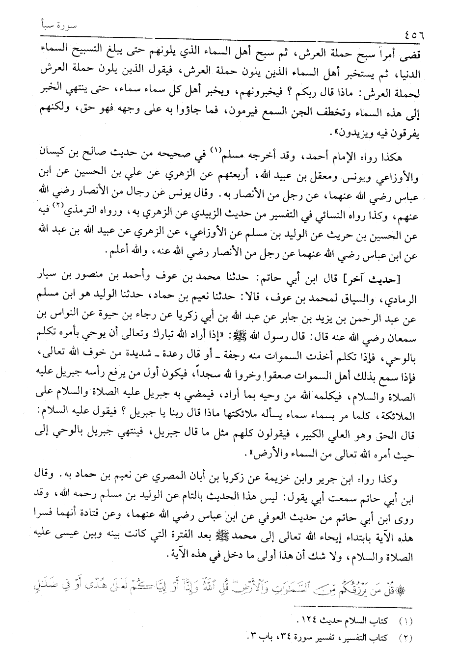 [حَدِيثٌ آخَرُ] قَالَ ابْنُ أَبِي حَاتِمٍ: حَدَّثَنَا مُحَمَّدُ بْنُ عَوْفٍ وَأَحْمَدُ بْنُ مَنْصُورِ بْنِ سَيَّارٍ الرَّمَادِيُّ، وَالسِّيَاقُ لِمُحَمَّدِ بْنِ عَوْفٍ، قَالَا: حَدَّثَنَا نُعَيْمُ بْنُ حَمَّادٍ، حَدَّثَنَا الْوَلِيدُ هُوَ ابْنُ مُسْلِمٍ عَنْ عَبْدِ الرَّحْمَنِ بْنِ يَزِيدَ بْنِ جَابِرٍ عَنْ عَبْدِ اللَّهِ بن أبي زكريا عَنْ رَجَاءِ بْنِ حَيْوَةَ عَنِ النَّوَّاسِ بْنِ سمعان رَضِيَ اللَّهُ عَنْهُ قَالَ: قَالَ رَسُولُ اللَّهِ صَلَّى اللَّهُ عَلَيْهِ وَسَلَّمَ: «إِذَا أَرَادَ اللَّهُ تبارك وتعالى أَنْ يُوحِيَ بِأَمْرِهِ تَكَلَّمَ بِالْوَحْيِ، فَإِذَا تَكَلَّمَ أخذت السموات مِنْهُ رَجْفَةٌ- أَوْ قَالَ رِعْدَةٌ- شَدِيدَةٌ مِنْ خوف الله تعالى، فإذا سمع بذلك أهل السموات صَعِقُوا وَخَرُّوا لِلَّهِ سُجَّدًا، فَيَكُونُ أَوَّلُ مَنْ يرفع رأسه جبريل عليه الصلاة والسلام، فَيُكَلِّمُهُ اللَّهُ مِنْ وَحْيِهِ بِمَا أَرَادَ، فَيَمْضِي به جبريل عليه الصلاة والسلام على الملائكة، كلما مر بسماء سماء يسأله مَلَائِكَتُهَا مَاذَا قَالَ رَبُّنَا يَا جِبْرِيلُ؟ فَيَقُولُ عليه السلام: