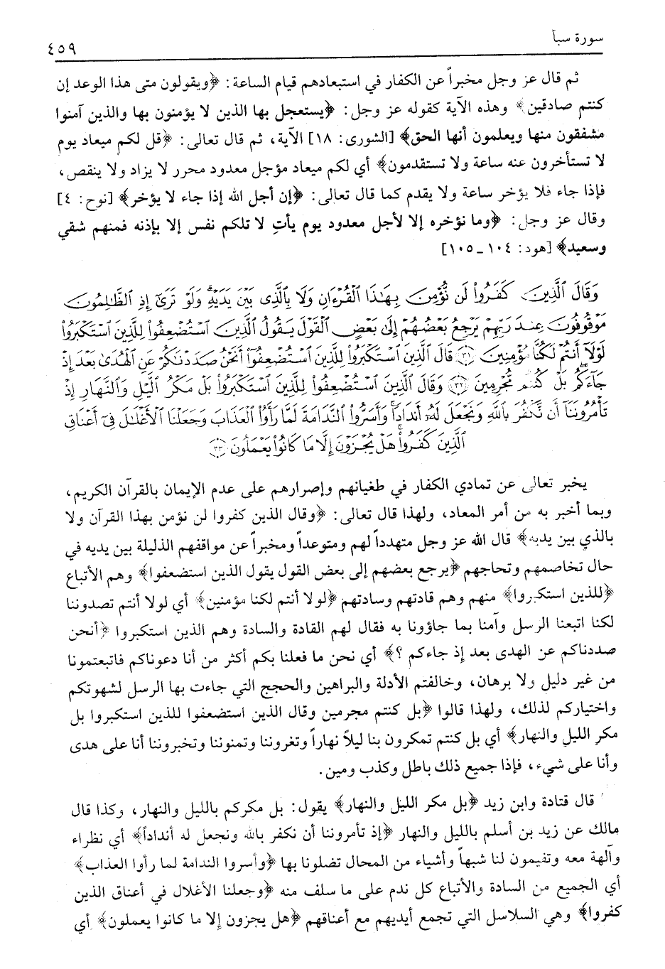 وَقالَ الَّذِينَ كَفَرُوا لَنْ نُؤْمِنَ بِهذَا الْقُرْآنِ وَلا بِالَّذِي بَيْنَ يَدَيْهِ وَلَوْ تَرى إِذِ الظَّالِمُونَ مَوْقُوفُونَ عِنْدَ رَبِّهِمْ يَرْجِعُ بَعْضُهُمْ إِلى بَعْضٍ الْقَوْلَ يَقُولُ الَّذِينَ اسْتُضْعِفُوا لِلَّذِينَ اسْتَكْبَرُوا لَوْلا أَنْتُمْ لَكُنَّا مُؤْمِنِينَ (31) قالَ الَّذِينَ اسْتَكْبَرُوا لِلَّذِينَ اسْتُضْعِفُوا أَنَحْنُ صَدَدْناكُمْ عَنِ الْهُدى بَعْدَ إِذْ جاءَكُمْ بَلْ كُنْتُمْ مُجْرِمِينَ (32) وَقالَ الَّذِينَ اسْتُضْعِفُوا لِلَّذِينَ اسْتَكْبَرُوا بَلْ مَكْرُ اللَّيْلِ وَالنَّهارِ إِذْ تَأْمُرُونَنا أَنْ نَكْفُرَ بِاللَّهِ وَنَجْعَلَ لَهُ أَنْداداً وَأَسَرُّوا النَّدامَةَ لَمَّا رَأَوُا الْعَذابَ وَجَعَلْنَا الْأَغْلالَ فِي أَعْناقِ الَّذِينَ كَفَرُوا هَلْ يُجْزَوْنَ إِلاَّ مَا كانُوا يَعْمَلُونَ (33)