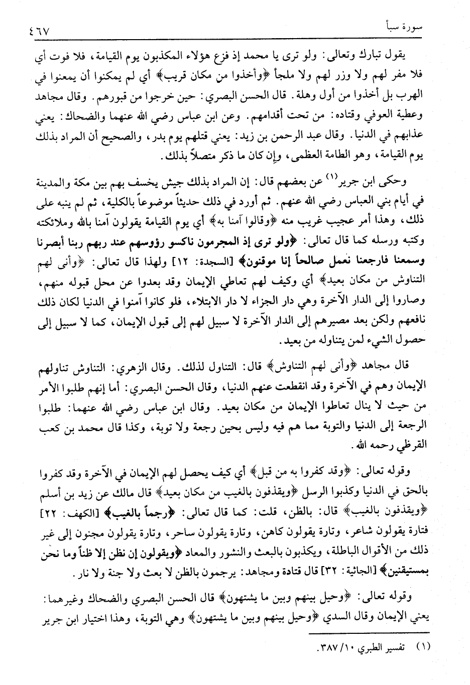 وَحَكَى ابْنُ جَرِيرٍ «1» عَنْ بَعْضِهِمْ قَالَ: إِنَّ الْمُرَادَ بِذَلِكَ جَيْشٌ يُخْسَفُ بِهِمْ بَيْنَ مكة والمدينة في أيام بني العباس رضي الله عنهم. ثُمَّ أَوْرَدَ فِي ذَلِكَ حَدِيثًا مَوْضُوعًا بِالْكُلِّيَّةِ، ثُمَّ لَمْ يُنَبِّهُ عَلَى ذَلِكَ، وَهَذَا أَمْرٌ عَجِيبٌ غَرِيبٌ مِنْهُ وَقالُوا آمَنَّا بِهِ أَيْ يوم القيامة يقولون آمنا بالله وملائكته وكتبه وَرُسُلِهِ كَمَا قَالَ تَعَالَى: وَلَوْ تَرى إِذِ الْمُجْرِمُونَ ناكِسُوا رُؤُسِهِمْ عِنْدَ رَبِّهِمْ رَبَّنا أَبْصَرْنا وَسَمِعْنا فَارْجِعْنا نَعْمَلْ صالِحاً إِنَّا مُوقِنُونَ [السَّجْدَةِ: 12] وَلِهَذَا قَالَ تَعَالَى: وَأَنَّى لَهُمُ التَّناوُشُ مِنْ مَكانٍ بَعِيدٍ أَيْ وَكَيْفَ لَهُمْ تَعَاطِي الْإِيمَانِ وَقَدْ بَعُدُوا عَنْ مَحَلِّ قَبُولِهِ مِنْهُمْ، وَصَارُوا إِلَى الدَّارِ الْآخِرَةَ وَهِيَ دَارُ الْجَزَاءِ لَا دَارُ الِابْتِلَاءِ، فَلَوْ كَانُوا آمِنُوا فِي الدُّنْيَا لَكَانَ ذَلِكَ نَافِعَهُمْ وَلَكِنْ بَعْدَ مَصِيرِهِمْ إِلَى الدَّارِ الْآخِرَةَ لَا سَبِيلَ لَهُمْ إِلَى قَبُولِ الْإِيمَانِ، كَمَا لَا سَبِيلَ إِلَى حُصُولِ الشَّيْءِ لِمَنْ يَتَنَاوَلُهُ مِنْ بَعِيدٍ.