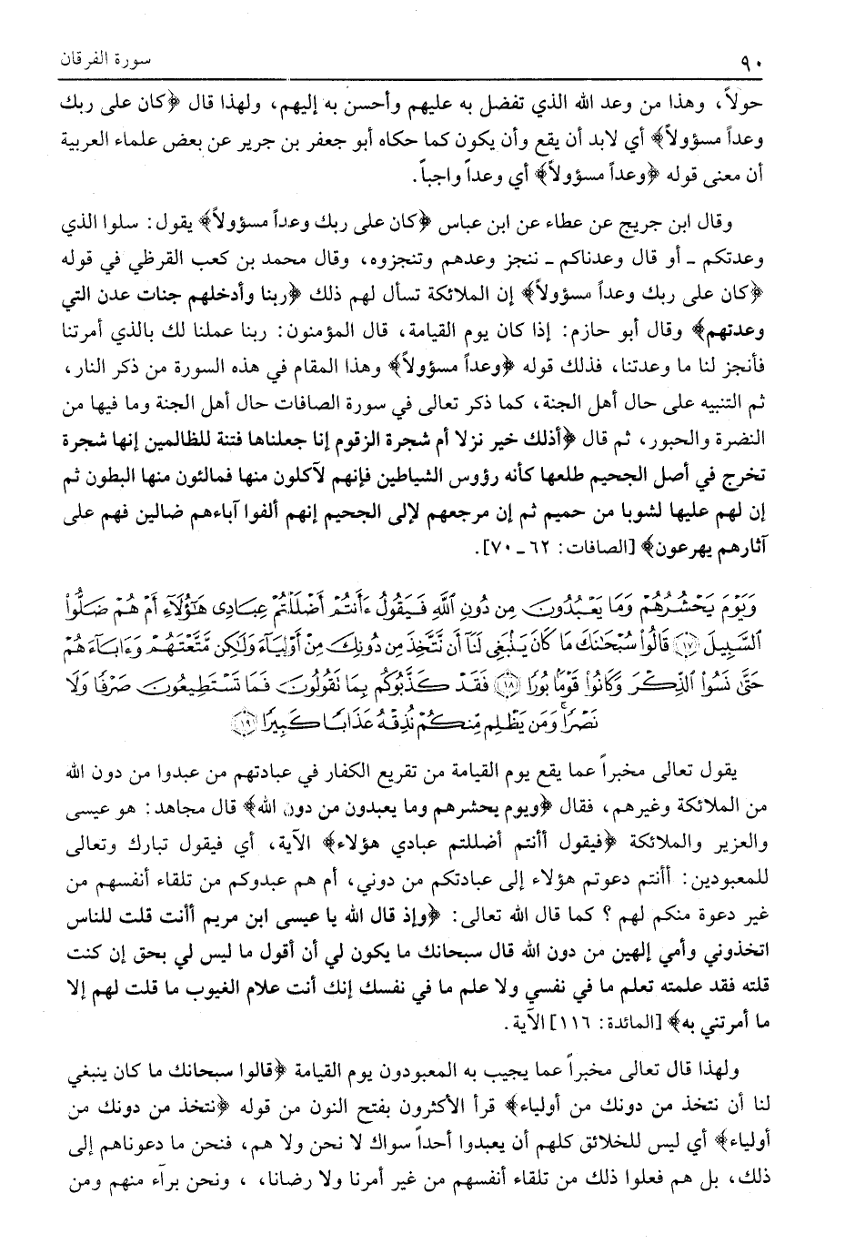 وَقَالَ ابْنِ جُرَيْجٍ عَنْ عَطَاءٍ عَنِ ابْنِ عَبَّاسٍ كانَ عَلى رَبِّكَ وَعْداً مَسْؤُلًا يقول: سلوا الذي وعدتكم- أو قال وعدناكم- ننجز وعدهم وتنجزوه، وَقَالَ مُحَمَّدُ بْنُ كَعْبٍ الْقُرَظِيُّ فِي قَوْلِهِ كانَ عَلى رَبِّكَ وَعْداً مَسْؤُلًا إِنَّ الْمَلَائِكَةَ تَسْأَلُ لَهُمْ ذَلِكَ رَبَّنا وَأَدْخِلْهُمْ جَنَّاتِ عَدْنٍ الَّتِي وَعَدْتَهُمْ وَقَالَ أَبُو حَازِمٍ: إِذَا كَانَ يَوْمُ الْقِيَامَةِ، قَالَ الْمُؤْمِنُونَ: رَبَّنَا عَمِلْنَا لَكَ بِالَّذِي أَمَرْتَنَا فَأَنْجِزْ لَنَا مَا وَعَدْتَنَا، فَذَلِكَ قَوْلُهُ وَعْداً مَسْؤُلًا وَهَذَا الْمَقَامُ فِي هَذِهِ السُّورَةِ مَنْ ذِكْرِ النَّارِ، ثُمَّ التَّنْبِيهِ عَلَى حَالِ أَهْلِ الْجَنَّةِ، كَمَا ذَكَرَ تَعَالَى فِي سُورَةِ الصَّافَّاتِ حَالَ أَهْلِ الْجَنَّةِ وَمَا فِيهَا مِنَ النَّضْرَةِ وَالْحُبُورِ، ثُمَّ قَالَ أَذلِكَ خَيْرٌ نُزُلًا أَمْ شَجَرَةُ الزَّقُّومِ إِنَّا جَعَلْناها فِتْنَةً لِلظَّالِمِينَ إِنَّها شَجَرَةٌ تَخْرُجُ فِي أَصْلِ الْجَحِيمِ طَلْعُها كَأَنَّهُ رُؤُسُ الشَّياطِينِ فَإِنَّهُمْ لَآكِلُونَ مِنْها فَمالِؤُنَ مِنْهَا الْبُطُونَ ثُمَّ إِنَّ لَهُمْ عَلَيْها لَشَوْباً مِنْ حَمِيمٍ ثُمَّ إِنَّ مَرْجِعَهُمْ لَإِلَى الْجَحِيمِ إِنَّهُمْ أَلْفَوْا آباءَهُمْ ضالِّينَ فَهُمْ عَلى آثارِهِمْ يُهْرَعُونَ [الصافات: 62- 70] .