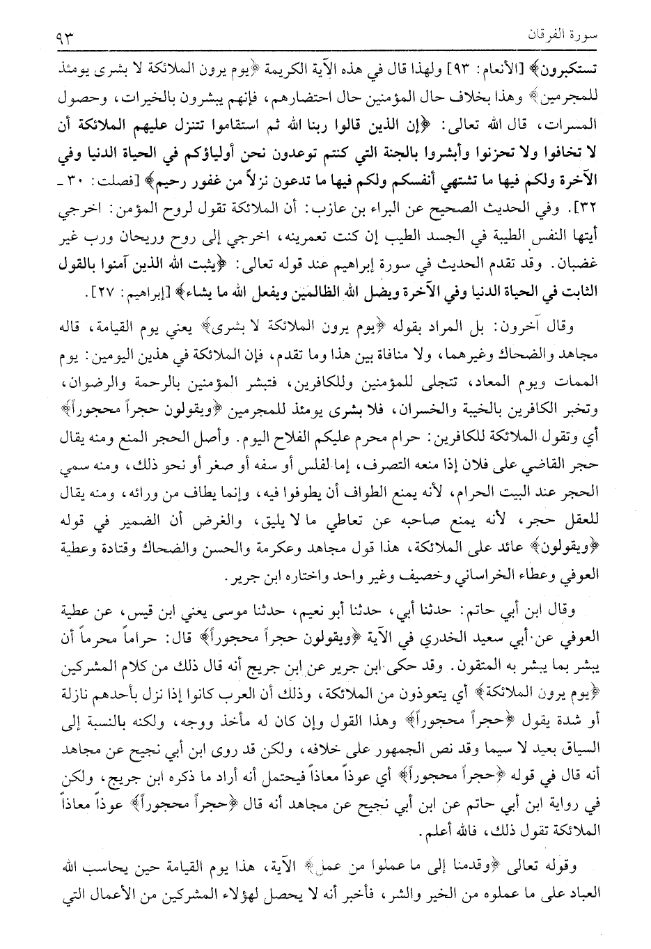 وَقَالَ آخَرُونَ: بَلِ الْمُرَادُ بِقَوْلِهِ يَوْمَ يَرَوْنَ الْمَلائِكَةَ لا بُشْرى يَعْنِي يَوْمَ الْقِيَامَةِ، قَالَهُ مُجَاهِدٌ وَالضَّحَّاكُ وَغَيْرُهُمَا، ولا منافاة بين هذا وما تَقَدَّمَ، فَإِنَّ الْمَلَائِكَةَ فِي هَذَيْنَ الْيَوْمَيْنِ: يَوْمِ الْمَمَاتِ وَيَوْمِ الْمَعَادِ، تَتَجَلَّى لِلْمُؤْمِنِينَ وَلِلْكَافِرِينَ، فَتُبَشِّرُ الْمُؤْمِنِينَ بِالرَّحْمَةِ وَالرِّضْوَانِ، وَتُخْبِرُ الْكَافِرِينَ بِالْخَيْبَةِ وَالْخُسْرَانِ، فَلَا بُشْرَى يَوْمئِذٍ لِلْمُجْرِمِينَ وَيَقُولُونَ حِجْراً مَحْجُوراً أَيْ وَتَقُولُ الْمَلَائِكَةُ لِلْكَافِرِينَ: حَرَامٌ مُحَرَّمٌ عَلَيْكُمُ الْفَلَّاحُ الْيَوْمَ. وَأَصْلُ الْحِجْرِ الْمَنْعُ وَمِنْهُ يُقَالُ حَجَرَ الْقَاضِي عَلَى فُلَانٍ إِذَا مَنَعَهُ التَّصَرُّفَ، إما لفلس أو سفه أَوْ صِغَرٍ أَوْ نَحْوِ ذَلِكَ، وَمِنْهُ سُمِّيَ الْحَجَرُ عِنْدَ الْبَيْتِ الْحَرَامِ، لِأَنَّهُ يَمْنَعُ الطُّوَّافَ أَنْ يَطُوفُوا فِيهِ، وَإِنَّمَا يُطَافُ مِنْ وَرَائِهِ، وَمِنْهُ يُقَالُ لِلْعَقْلِ حِجْرٌ، لِأَنَّهُ يَمْنَعُ صَاحِبَهُ عَنْ تَعَاطِي مَا لَا يَلِيقُ، وَالْغَرَضُ أَنَّ الضَّمِيرَ فِي قَوْلِهِ وَيَقُولُونَ عَائِدٌ عَلَى الْمَلَائِكَةِ، هذا قول مجاهد وعكرمة والحسن والضحاك وَقَتَادَةَ وَعَطِيَّةَ الْعَوْفِيِّ وَعَطَاءٍ الْخُرَاسَانِيِّ وخُصَيفٍ وَغَيْرُ وَاحِدٍ وَاخْتَارَهُ ابْنُ جَرِيرٍ.