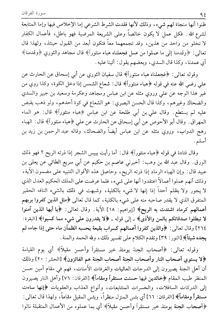 وقوله تعالى: فَجَعَلْناهُ هَباءً مَنْثُوراً قَالَ سُفْيَانُ الثَّوْرِيُّ عَنْ أَبِي إِسْحَاقَ عَنِ الْحَارِثِ عَنْ عَلِيٍّ رَضِيَ اللَّهُ عَنْهُ فِي قَوْلِهِ هَباءً مَنْثُوراً قَالَ: شُعَاعُ الشَّمْسِ إِذَا دَخَلَ الْكُوَّةِ، وَكَذَا رُوِيَ مِنْ غَيْرِ هَذَا الْوَجْهِ عَنْ عَلَيٍّ وَرُوِيَ مِثْلُهُ عَنِ ابْنِ عَبَّاسٍ وَمُجَاهِدٍ وَعِكْرِمَةَ وَسَعِيدِ بْنِ جُبَيرٍ والسُّدِّيِّ وَالضَّحَّاكِ وَغَيْرِهِمْ، وَكَذَا قَالَ الْحَسَنُ الْبَصْرِيُّ: هُوَ الشُّعَاعُ فِي كُوَّةِ أَحَدِهِمْ، وَلَوْ ذَهَبَ يَقْبِضُ عَلَيْهِ لَمْ يَسْتَطِعْ. وَقَالَ عَلِيُّ بْنُ أَبِي طَلْحَةَ عَنِ ابْنِ عَبَّاسٍ هَباءً مَنْثُوراً قَالَ: هُوَ الْمَاءُ الْمِهْرَاقُ. وَقَالَ أَبُو الْأَحْوَصِ عَنْ أَبِي إِسْحَاقَ عَنِ الْحَارِثِ عَنْ عَلِيٍّ هَباءً مَنْثُوراً قَالَ: الْهَبَاءُ رَهْجُ الدَّوَابِّ، وَرُوِيَ مِثْلُهُ عَنِ ابْنِ عَبَّاسٍ أَيْضًا وَالضَّحَّاكِ، وَقَالَهُ عَبْدُ الرَّحْمَنِ بْنُ زَيْدِ بْنِ أَسْلَمَ.
