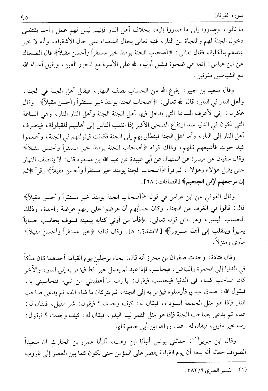 وَقَالَ سَعِيدُ بْنُ جُبَيْرٍ: يَفْرَغُ اللَّهُ مِنَ الْحِسَابِ نِصْفَ النَّهَارِ، فَيَقِيلُ أَهْلُ الْجَنَّةِ فِي الْجَنَّةِ، وَأَهْلُ النَّارِ فِي النَّارِ، قَالَ اللَّهُ تَعَالَى: أَصْحابُ الْجَنَّةِ يَوْمَئِذٍ خَيْرٌ مُسْتَقَرًّا وَأَحْسَنُ مَقِيلًا. وَقَالَ عِكْرِمَةُ: إِنِّي لَأَعْرِفُ السَّاعَةَ الَّتِي يَدْخُلُ فِيهَا أَهْلُ الْجَنَّةِ الْجَنَّةَ وأهل النار النار، وهي السَّاعَةُ الَّتِي تَكُونُ فِي الدُّنْيَا عِنْدَ ارْتِفَاعِ الضُّحَى الْأَكْبَرِ إِذَا انْقَلَبَ النَّاسُ إِلَى أَهْلِيهِمْ لِلْقَيْلُولَةِ، فَيَنْصَرِفُ أَهْلُ النَّارِ إِلَى النَّارِ، وَأَمَّا أَهْلُ الْجَنَّةِ فَيُنْطَلَقُ بِهِمْ إِلَى الْجَنَّةِ فَكَانَتْ قَيْلُولَتُهُمْ فِي الْجَنَّةِ، وَأُطْعِمُوا كَبِدَ حُوتٍ فَأَشْبَعَهُمْ كُلَّهُمْ، وَذَلِكَ قَوْلُهُ أَصْحابُ الْجَنَّةِ يَوْمَئِذٍ خَيْرٌ مُسْتَقَرًّا وَأَحْسَنُ مَقِيلًا وَقَالَ سُفْيَانُ عَنْ مَيْسَرَةَ عَنِ الْمِنْهَالِ عَنْ أَبِي عُبَيْدَةَ عَنْ عَبْدِ اللَّهِ بْنِ مَسْعُودٍ قَالَ: لَا يَنْتَصِفُ النَّهَارُ حَتَّى يَقِيلَ هَؤُلَاءِ وَهَؤُلَاءِ، ثُمَّ قَرَأَ أَصْحابُ الْجَنَّةِ يَوْمَئِذٍ خَيْرٌ مُسْتَقَرًّا وَأَحْسَنُ مَقِيلًا وَقَرَأَ ثُمَّ إِنَّ مَرْجِعَهُمْ لَإِلَى الْجَحِيمِ [الصَّافَّاتِ: 68] .