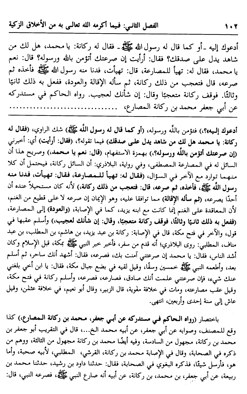 أدعوك إليه" -أو كما قال له رسول الله -صلى الله عليه وسلم- فقال له ركانة: يا محمد، هل لك من شاهد يدل على صدقك؟ فقال: "أرأيت إن صرعتك أتؤمن بالله ورسوله؟ " قال: نعم يا محمد، فقال له: "تهيأ للمصارعة"، قال: تهيأت، فدنا منه رسول الله -صلى الله عليه وسلم- فأخذه ثم صرعه، قال: فتعجب من ذلك ركانة، ثم سأله الإقالة والعودة، ففعل به ذلك ثانيًا وثالثًا. فوقف ركانة متعجبًا وقال: إن شأنك لعجيب. رواه الحاكم في مستدركه عن أبي جعفر محمد بن ركانة المصارع،............