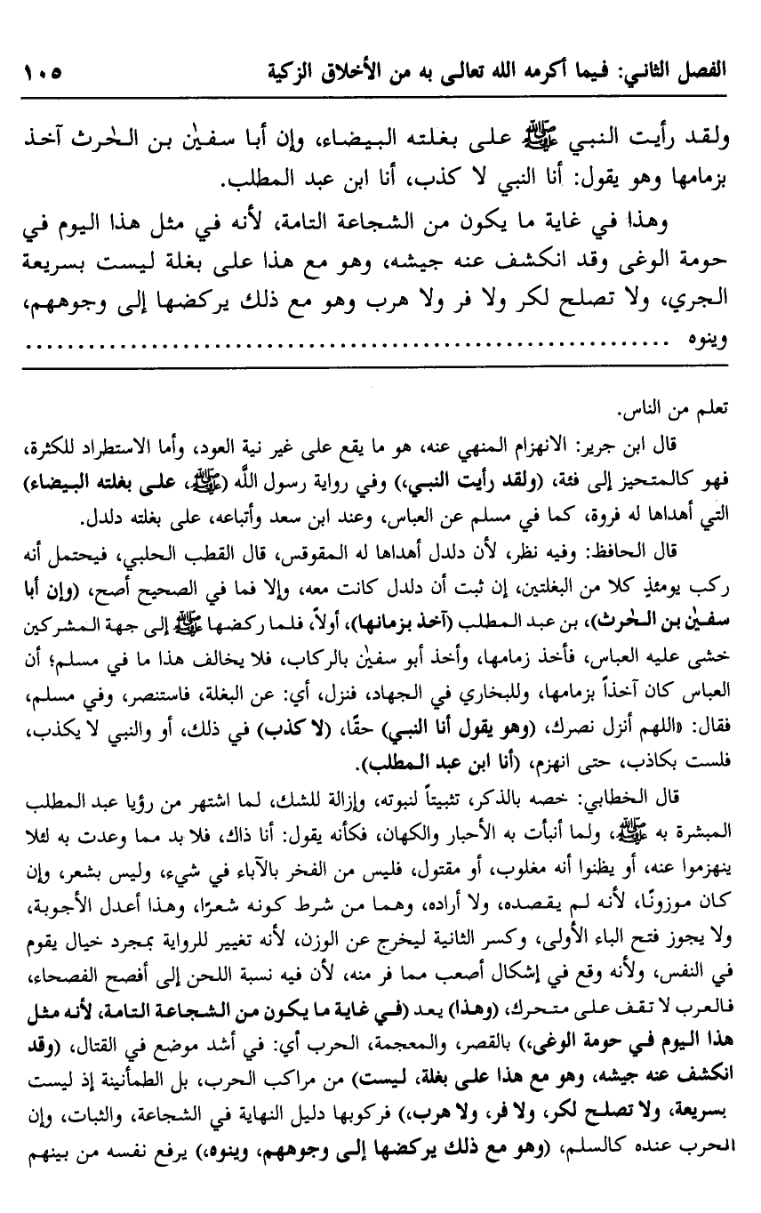 وهذا في غاية ما يكون من الشجاعة التامة، لأنه في مثل هذا اليوم في حومة الوغى وقد انكشف عنه جيشه، وهو مع هذا على بغلة ليست بسريعة الجري، ولا تصلح لكرٍّ ولا فر ولا هرب, وهو مع ذلك يركضها إلى وجوههم، وينوه........................