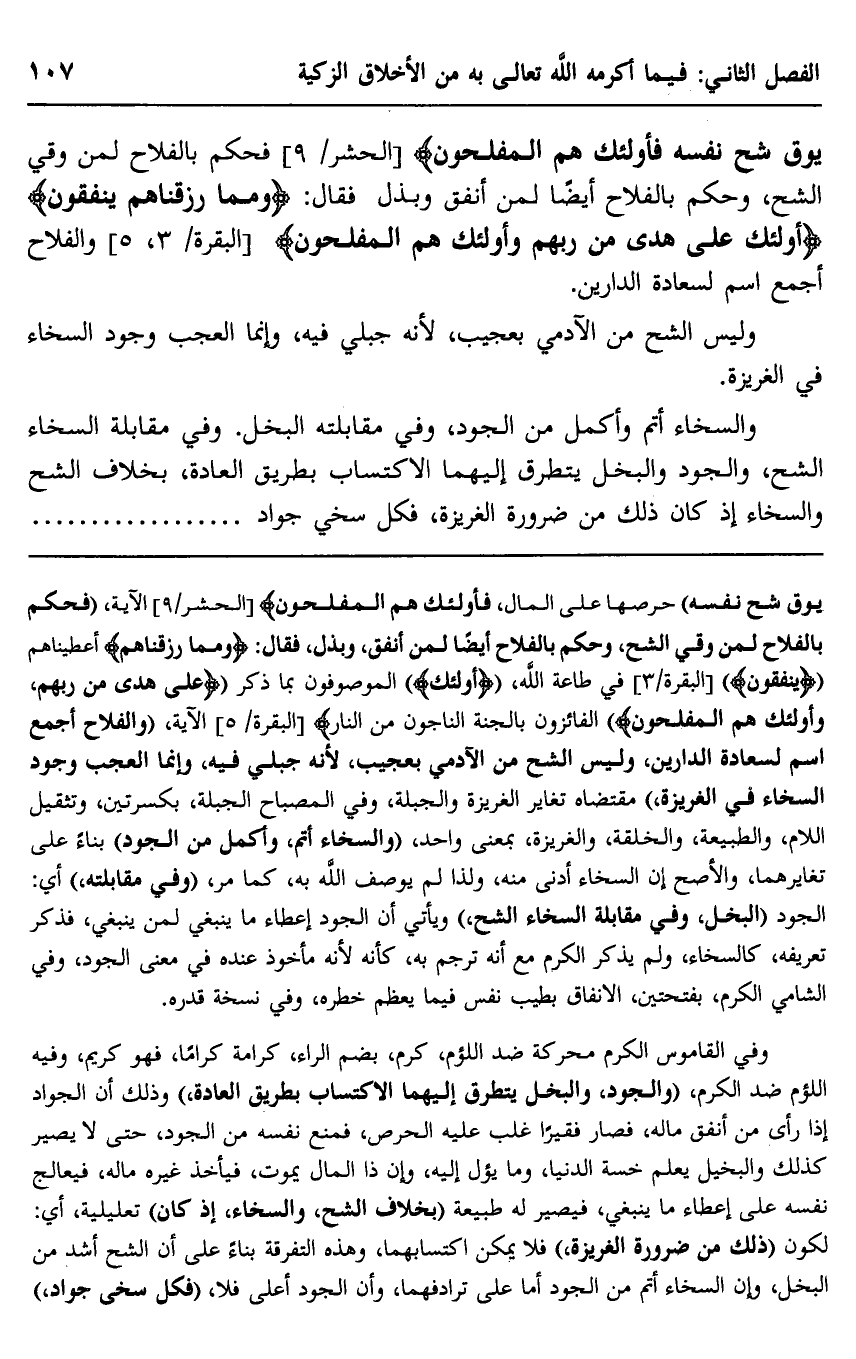 يُوقَ شُحَّ نَفْسِهِ فَأُولَئِكَ هُمُ الْمُفْلِحُونَ} [الحشر: 9] ، فحكم بالفلاح لمن وقي الشح، وحكم بالفلاح أيضا لمن أنفق وبذل فقال: {وَمِمَّا رَزَقْنَاهُمْ يُنْفِقُونَ} ، {أُولَئِكَ عَلَى هُدًى مِنْ رَبِّهِمْ وَأُولَئِكَ هُمُ الْمُفْلِحُونَ} [البقرة: 3، 5] والفلاح أجمع اسم لسعادة الدارين.