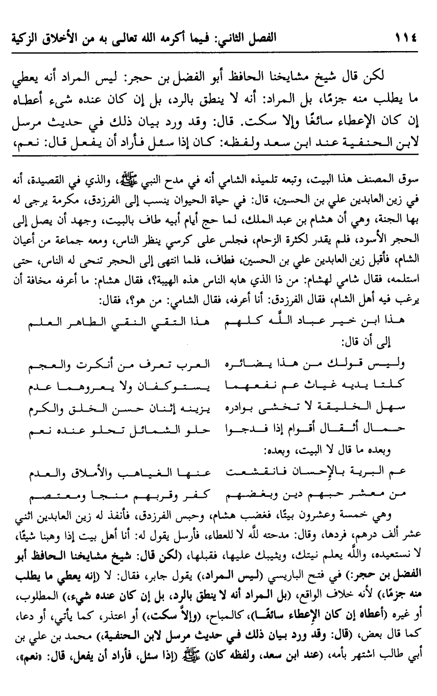 سوق المصنف هذا البيت، وتبعه تلميذه الشامي أنه في مدح النبي -صلى الله عليه وسلم، والذي في القصيدة أنه في زين العابدين علي بن الحسين، قال في حياة الحيوان: ينسب إلى الفرزدق، مكرمة يرجى له بها الجنة، وهي أن هشام بن عبد الملك لما حجَّ أيام أبيه طاف بالبيت، وجهد أن يصل إلى الحجر الأسود، فلم يقدر لكثرة الزحام، فجلس على كرسي ينظر الناس، ومعه جماعة من أعيان الشام، فأقبل زين العابدين علي بن الحسين فطاف، فلما انتهى إلى الحجر تنحّى له الناس حتى استلمه، فقال شامي لهشام: من ذا الذي هابه الناس هذه الهيبة؟ فقال هشام: ما أعرفه مافة أن يرغب فيه أهل الشام، فقال الفرزدق: أنا أعرفه، فقال الشامي: من هو؟ فقال: