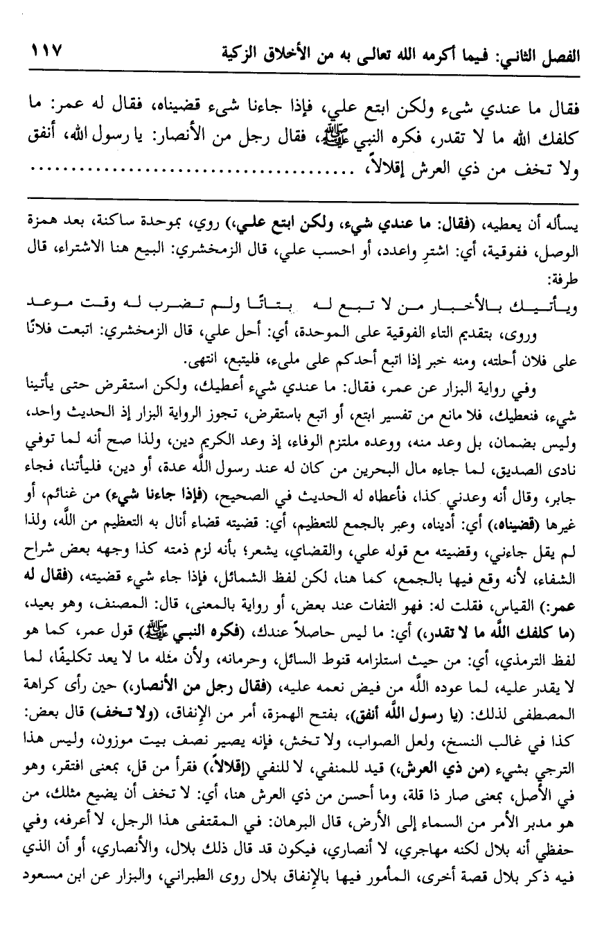 وفي رواية البزار عن عمر، فقال: "ما عندي شيء أعطيك، ولكن استقرض حتى يأتينا شيء فنعطيك"، فلا مانع من تفسير ابتع، أو اتبع باستقرض، تجوز الرواية البزار إذ الحديث واحد، وليس بضمان، بل وعد منه، ووعده ملتزم الوفاء؛ إذ وعد الكريم دَيْن، ولذا صحَّ أنه لما توفي نادى لصديق لما جاءه مال البحرين من كان له عند رسول الله عدة أو دين فليأتنا، فجاء جابر وقال: إنه وعدني كذا، فأعطاه له الحديث في الصحيح، "فإذا جاءنا شيء" من غنائم، أو غيرها "قضيناه" أي: أدَّيناه، وعبَّر بالجمع للتعظيم، أي: فضيته قضاء أنال به التعظيم من الله، ولذا لم يقل: جاءني، وقضيته مع قوله: عليَّ، والقضاء يشعر بأنه لزم زمته, كذا وجهه بعض شراح الشفاء؛ لأنه وقع فيها بالجمع كما هنا، لكن لفظ الشمائل: "فإذا جاء شيء قضيته"، "فقال له عمر" القياس، فقلت له: فهو التفات عند بعض، أو رواية بالمعنى، قال المصنف: وهو بعيد، "ما كلفك الله ما لا تقدر" أي: ما ليس حاصلًا عندك، "فكره النبي -صلى الله عليه وسلم" قول عمر، كما هو لفظ الترمذي، أي: من حيث استلزامه قنوط السائل وحرمانه؛ ولأن مثله ما لا يعد تكليفًا لما لا يقدر عليه، لما عوَّده الله من فيض نعمه عليه، "فقال رجل من الأنصار"؛ حيث رأى كراهة المصطفى لذلك: "يا رسول الله أنفق" بفتح الهمزة، أمر من الإنفاق، "ولا تخف" قال بعض: كذا في غالب النسخ، ولعل الصواب، ولا تخش، فإنه يصير نصف بيت موزون، وليس هذا الترجي بشيء "من ذي العرش" قيد للمنفي، لا للنفي "إقلالًا" فقرأ من قلَّ بمعنى افتقر، وهو في الأصل بمعنى صار ذا قلة، وما أحسن من ذي العرش هنا، أي: لا تخف أن يضيِّع مثلك من هو مدبر الأمر من السماء إلى الأرض، قال البرهان في المقتفى: هذا الرجل لا أعرفه، وفي حفظي أنه بلال, لكنه مهاجري لا أنصاري، فيكون قد قال ذلك بلال والأنصاري، أو أن الذي فيه ذكر بلال قصة أخرى، المأمور فيها بالإنفاق بلال. روى الطبراني، والبزار عن ابن مسعود