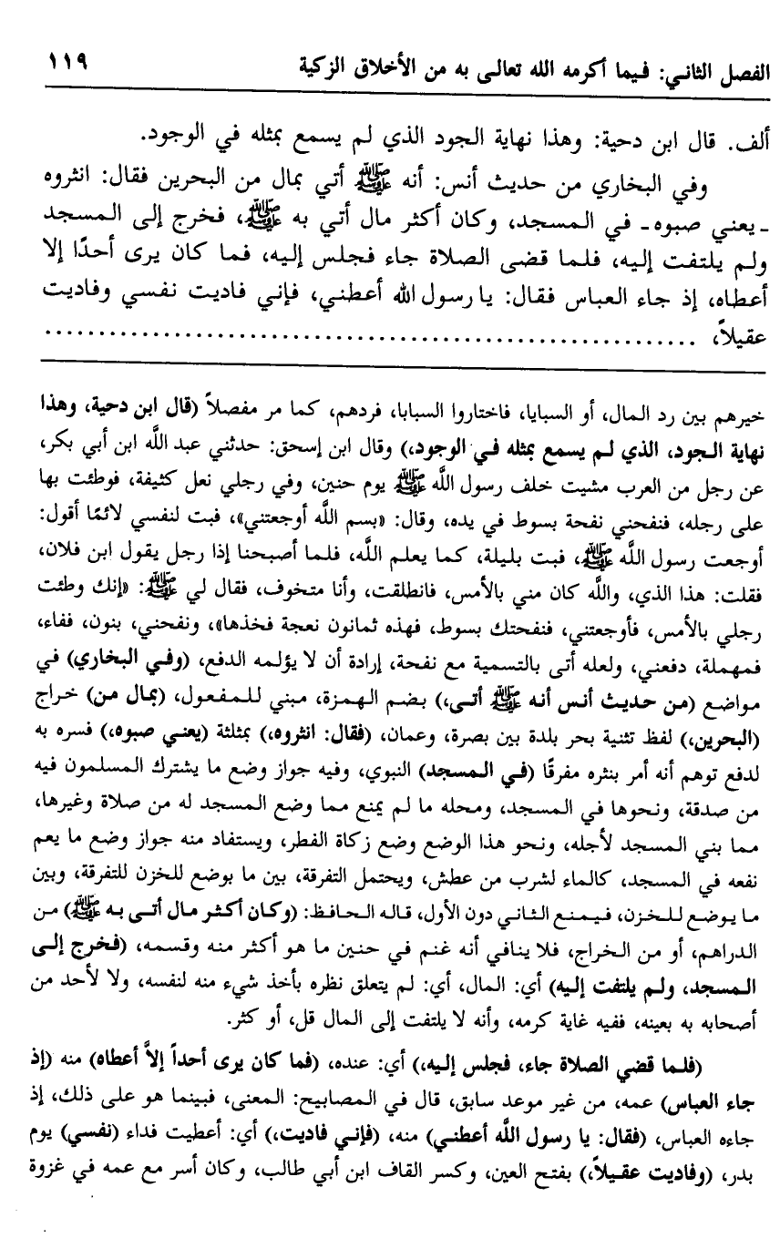 وفي البخاري من حديث أنس: إنه -صلى الله عليه وسلم- أتي بمال البحرين فقال: "انثروه" -يعني صبوه- في المسجد، وكان أكثر مال أتي به -صلى الله عليه وسلم، فخرج إلى المسجد ولم يلتفت إليه، فلمَّا قضى الصلاة جاء فجلس إليه، فما كان يرى أحدًا إلا أعطاه؛ إذ جاء العباس فقال: يا رسول الله أعطني، فإني فاديت نفسي وفاديت عقيلًا،..................