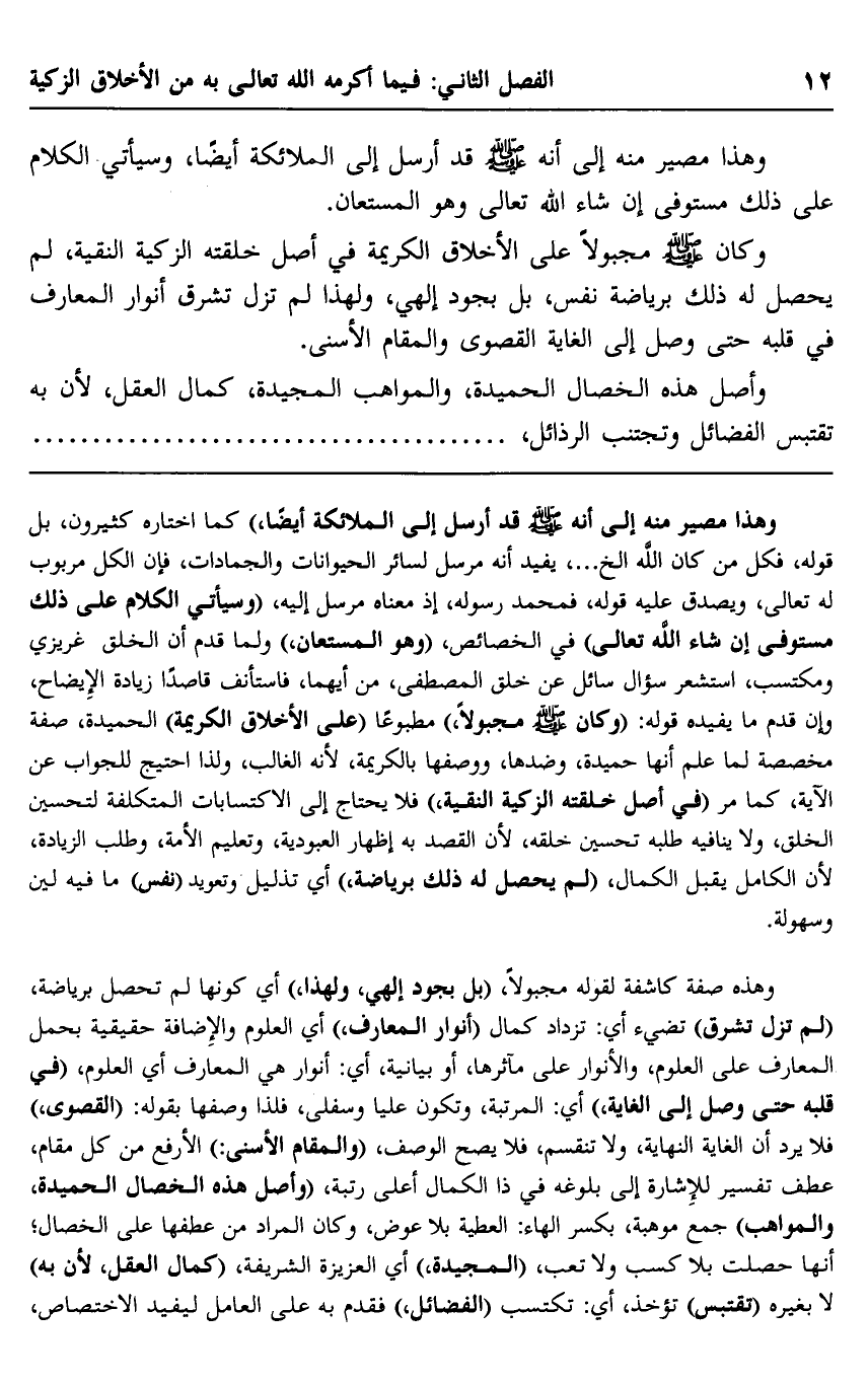 وكان -صلى الله عليه وسلم- مجبولًا على الأخلاق الكريمة في أصل خلقته الزكية النقية، لم يحصل له ذلك برياضة نفس، بل بجود إلهي، ولهذا لم تزل تشرق أنوار المعارف في قلبه حتى وصل إلى الغاية القصوى والمقام الأسنى.