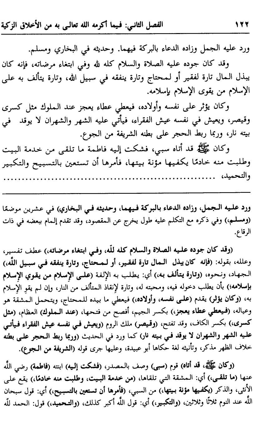 "وقد كان جوده -عليه الصلاة والسلام- كله لله، وفي ابتغاء مرضاته" عطف تفسير، وعلله بقوله: "فإنه كان يبذل المال تارة لفقير أو لمحتاج، وتارة ينفقه في سبيل الله" الجهاد ونحوه، "وتارة يتألّف به" أي: يطلب به الألفة "على الإسلام من يقوى الإسلام بإسلامه" بأن يطلب دخوله فيه، ومحبته له، وتارة لإنقاذ المتألف من النار وإن لم يقو الإسلام به، "وكان يؤثر" يقدم "على نفسه، وأولاده" فيعطي ما بيده للمحتاج، ويتحمل المشقة هو وعياله، "فيعطي عطاء يعجز" بكسر الجيم، أفصح من فتحها، "عند الملوك" العظام، "مثل كسرى" بكسر الكاف، وقد تفتح، "وقيصر" ملك الروم "ويعيش في نفسه عيش الفقراء, فيأتي عليه الشهر والشهران لا يوقد في بيته نار" كما ورد في الحديث "وربما ربط الحجر على بطنه خلاف الظهر مذكر، وتأنيثه لغة حكاها أبو عبيدة، وعليها جرى قوله "الشريفة من الجوع".