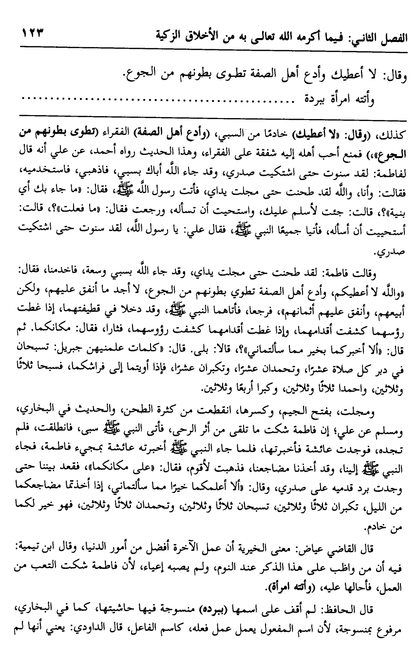 كذلك، "وقال: "لا أعطيك" خادمًا من السبي، "وأدع أهل الصفة" الفقراء "تطوى بطونهم من الجوع" , فمنع أحب أهله إليه شفقة على الفقراء، وهذا الحديث رواه أحمد، عن علي أنه قال لفاطمة: لقد سنوت حتى اشتكيت صدري، وقد جاء الله أباك بسبي، فاذهبي فاستخدميه، فقالت: وأنا والله لقد طحنت حتى مجلت يداي، فأتت رسول الله -صلى الله عليه وسلم- فقال: "ما جاء بك أي بنية؟ " قالت: جئت لأسلِّم عليك، واستحيت أن تسأله، ورجعت فقال: "ما فعلت"؟، قالت: استحييت أن أسأله، فأتيا جميعًا النبي -صلى الله عليه وسلم، فقال علي: يا رسول الله، لقد سنوت حتى اشتكيت صدري, وقالت فاطمة: لقد طحنت حتى مجلت يداي، وقد جاء الله بسبي وسعة، فأخدمنا، فقال: "والله لا أعطيكم، وأدع أهل الصفة تطوى بطونهم من الجوع، لا أجد ما أنفق عليهم، ولكن أبيعهم، وأنفق عليهم أثمانهم" فرجعا، فأتاهما النبي -صلى الله عليه وسلم، وقد دخلا في قطيفتهما، إذا غطت رءوسهما كشفت أقدامها، وإذا غطت أقدامهما كشفت رءوسهما، فثارا، فقال: مكانكما, ثم قال: "ألا أخبركما بخير مما سألتماني"؟، قالا: بلى. قال: "كلمات علمنيهنَّ جبريل: تسبحان في دبر كل صلاة عشرًا، وتحمدان عشرًا وتكبران عشرًا، فإذا أويتما إلى فراشكما، فسبحا ثلاثًا وثلاثين، واحمدا ثلاثًا وثلاثين، وكبرا أربعًا وثلاثين".