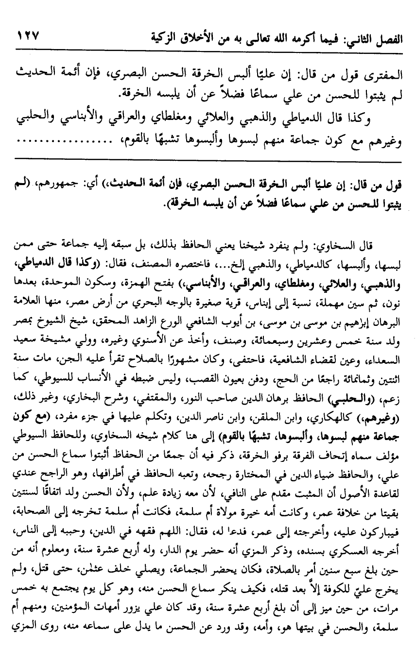 قال السخاوي: ولم ينفرد شيخنا يعني: الحافظ بذلك، بل سبقه إليه جماعة حتى ممن لبسها وألبسها، كالدمياطي، والذهبي إلخ..... فاختصره المصنف، فقال: "وكذا قال الدمياطي، والذهبي، والعلائي، ومغلطاي، والعراقي، والأبناسي" بفتح الهمزة، وسكون الموحدة، بعدها نون، ثم سين مهملة، نسبة إلى أبناس، قرية صغيرة بالوجه البحري من أرض مصر، منها العلامة البرهان إبراهيم بن موسى بن موسى، بن أيوب الشافعي الورع الزاهد المحقق، شيخ الشيوخ بمصر, ولد سنة خمس وعشرين وسبعمائة، وصنَّف وأخذ عن الأسنوي وغيره، وولي مشيخة سعيد السعداء، وعُيِّنَ لقضاء الشافعية فاحتفى، وكان مشهورًا بالصلاح, تقرأ عليه الجن، مات سنة اثنتين وثمانمائة راجعًا من الحج، ودفن بعيون القصب، وليس ضبطه في الأنساب للسيوطي، كما زعم، "والحلبي" الحافظ برهان الدين صاحب النور، والمقتفي، وشرح البخاري، وغير ذلك، "وغيرهم" كالهكاري، وابن الملقن، وابن ناصر الدين، وتكلم عليها في جزء مفرد، "مع كون جماعة منهم لبسوها وألبوها تشبهًا بالقوم" إلى هنا كلام شيخه السخاوي، وللحافظ السيوطي مؤلَّف سماه: إتحاف الفرقة برفو الخرقة، ذكر فيه أن جمعًا من الحفاظ أثبتوا سماع الحسن من علي، والحافظ ضياء الدين في المختارة رجَّحه، وتعبه الحافظ في أطرافها، وهو الراجح عندي لقاعدة الأصول أنَّ المثبت مقدَّم على النافي؛ لأن معه زيادة علم؛ ولأن الحسن ولد اتفاقًا لسنتين بقيتا من خلافة عمر، وكانت أمه خيرة مولاة أم سلمة، فكانت أم سلمة تخرجه إلى الصحابة، فيباركون عليه، وأخرجته إلى عمر، فدعا له فقال له: اللهم فقهه في الدين، وحببه إلى الناس، أخرجه العسكري بسنده، وذكر المزي أنه حضر يوم الدار وله أربع عشرة سنة، ومعلوم أنه من حين بلغ سبع سنين أمر بالصلاة، فكان يحضر الجماعة ويصلي خلف عثمان حتى قتل، ولم يخرج علي للكوفة إلّا بعد قتله، فكيف ينكر سماع الحسن منه وهو كل يوم يجتمع به خمس مرات، من حين مَيِّز إلى أن بلغ أربع عشرة سنة، وقد كان علي يزور أمهات المؤمنين، ومنهم أم سلمة، والحسن في بيتها هو وأمه، وقد ورد عن الحسن ما يدل على سماعه منه، روى المزي
