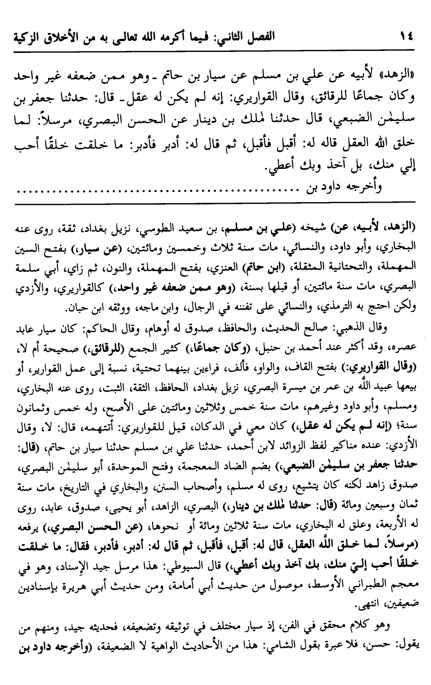 "الزهد" لأبيه, عن علي بن مسلم, عن سيار بن حاتم -وهو ممن ضعَّفه غير واحد, وكان جمَّاعًا للرقائق، وقال القواريري: إنه لم يكن له عقل. قال: حدثنا جعفر بن سليمان الضبعي قال: حدثنا مالك بن دينار عن الحسن البصري، مرسلًا: لما خلق الله العقل قال له: أقبل فأقبل، ثم قال له: أدبر فأدبر, فقال: ما خلقت خلقًا أحب إليّ منك، بل آخذ وبك أعطي.