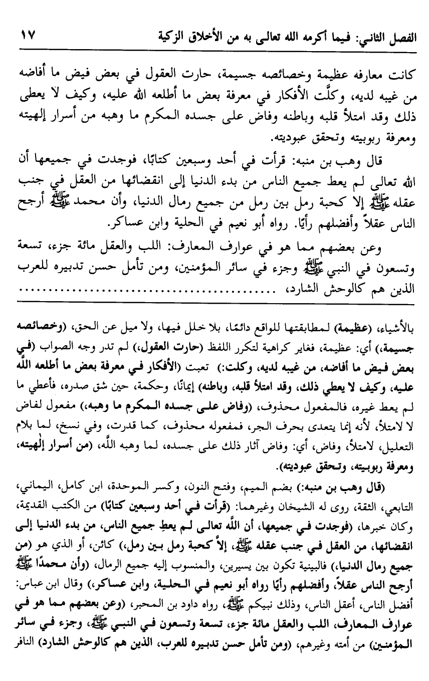 قال وهب بن منبه: قرأت في أحد وسبعين كتابًا، فوجدت في جميعها أنَّ الله تعالى لم يعط جميع الناس من بدء الدنيا إلى انقضائها من العقل في جنب عقله -صلى الله عليه وسلم- إلا كحبَّة رمل بين رمل من جميع رمال الدنيا، وأن محمد -صلى الله عليه وسلم- أرجح الناس عقلًا وأفضلهم رأيًا. رواه أبو نعيم في الحلية وابن عساكر.