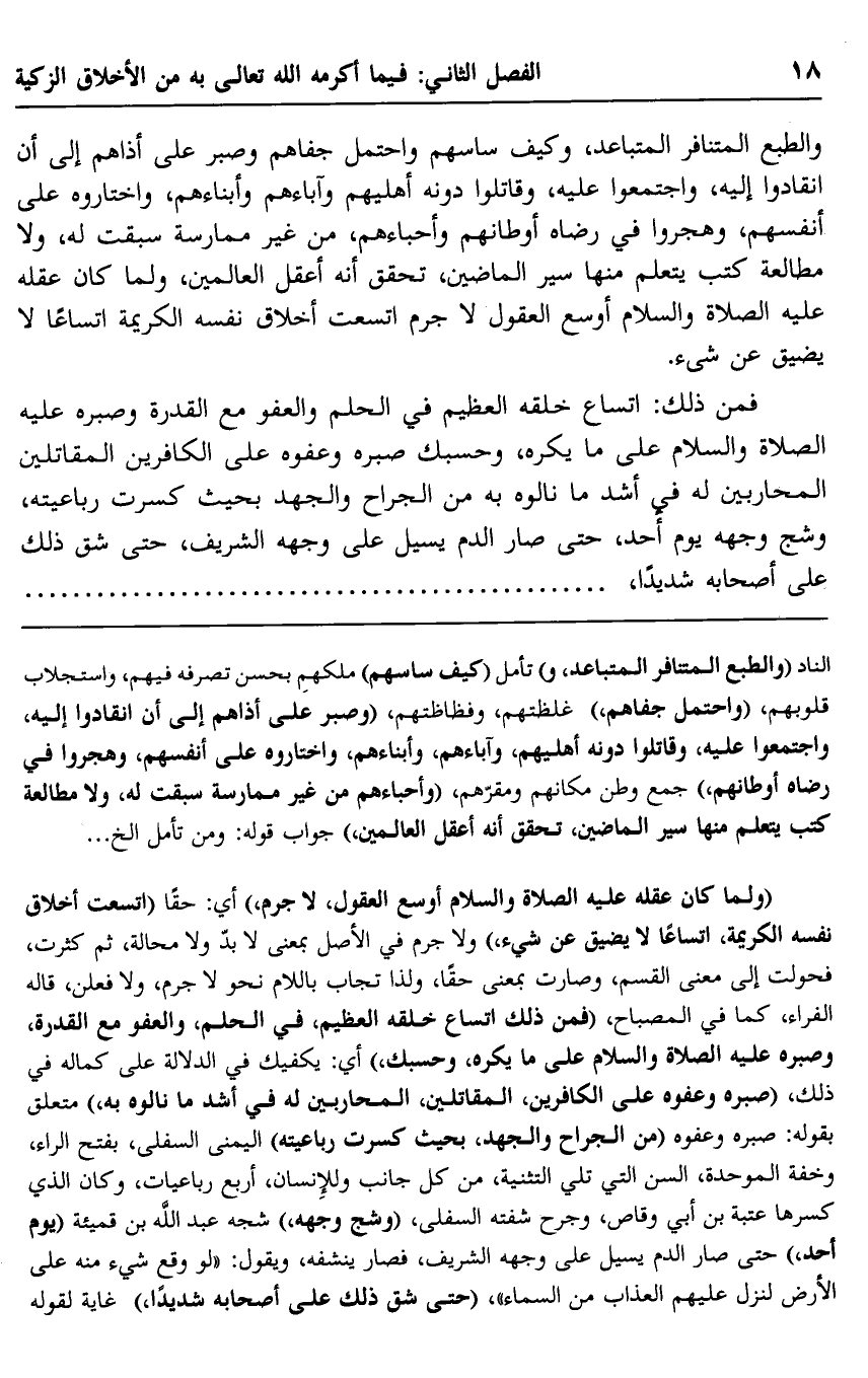 فمن ذلك: اتساع خلقه العظيم في الحلم والعفو مع القدرة, وصبره -عليه الصلاة والسلام- على ما يكره، وحسبك صبره وعفوه على الكافرين المقاتلين المحاربين له في أشد ما نالوه به من الجراح والجهد بحيث كُسِرت رباعيته، وشُجَّ وجهه يوم أحد، حتى صار الدم يسيل على وجهه الشريف، حتى شَقَّ ذلك على أصحابه شديدًا،.........................................................