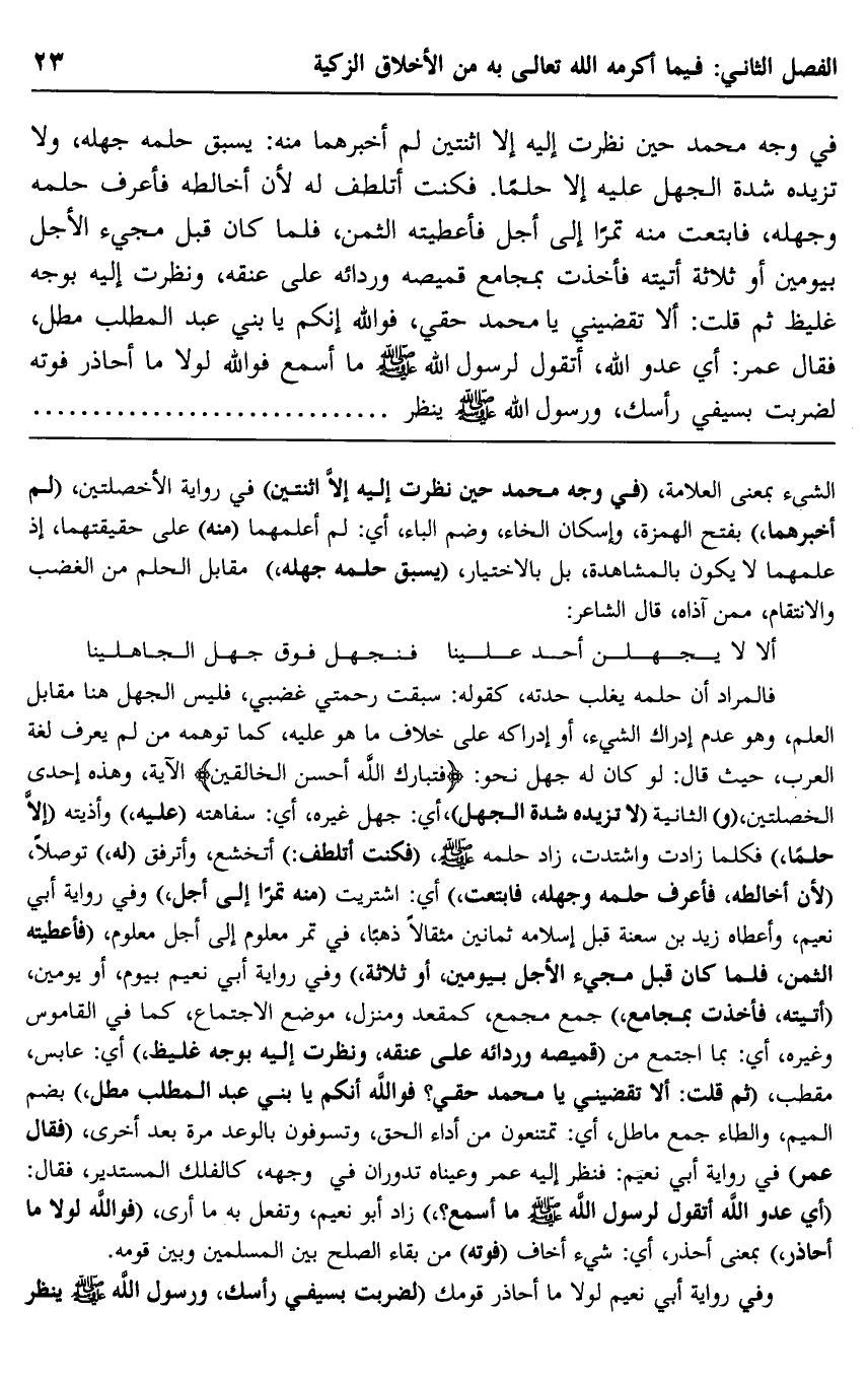 في وجه محمد حين نظرت إليه إلا اثنتين لم أخبرهما منه: يسبق حلمه جهله، ولا تزيده شدة الجهل عليه إلا حلمًا. فكنت أتلطف له لأن أخالطه فأعرف حلمه وجهله، فابتعت منه تمرًا إلى أجلٍ, فأعطيته الثمن، فلمَّا كان قبل مجيء الأجل بيومين أو ثلاثة أتيته, فأخذت بمجامع قميصه وردائه على عنقه، ونظرت إليه بوجه غليظ ثم قلت: ألا تقضيني يا محمد حقي، فوالله إنكم يا بني عبد المطلب مطل، فقال عمر: أي عدو الله، أتقول لرسول الله -صلى الله عليه وسلم- ما أسمع, فوالله لولا ما أحاذر فوته لضربت بسيفي رأسك، ورسول الله -صلى الله عليه وسلم- ينظر