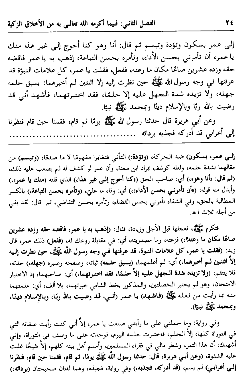 إلى عمر بسكون وتؤدة وتبسم ثم قال: "أنا وهو كنا أحوج إلى غير هذا منك يا عمر، أن تأمرني بحسن الأداء، وتأمره بحسن التباعة، اذهب به يا عمر فاقضه حقه وزده عشرين صاعًا مكان ما رعته"، ففعل، فقلت يا عمر: كل علامات النبوة قد عرفتها في وجه رسول الله -صلى الله عليه وسلم- حين نظرت إليه إلّا اثنتين لم أخبرهما: يسبق حلمه جهله، ولا تزيده شدة الجهل عليه إلا حلمًا، فقد اختبرتهما، فأشهد أني قد رضيت بالله ربًّا وبالإسلام دينًا وبمحمد -صلى الله عليه وسلم- نبيًّا.