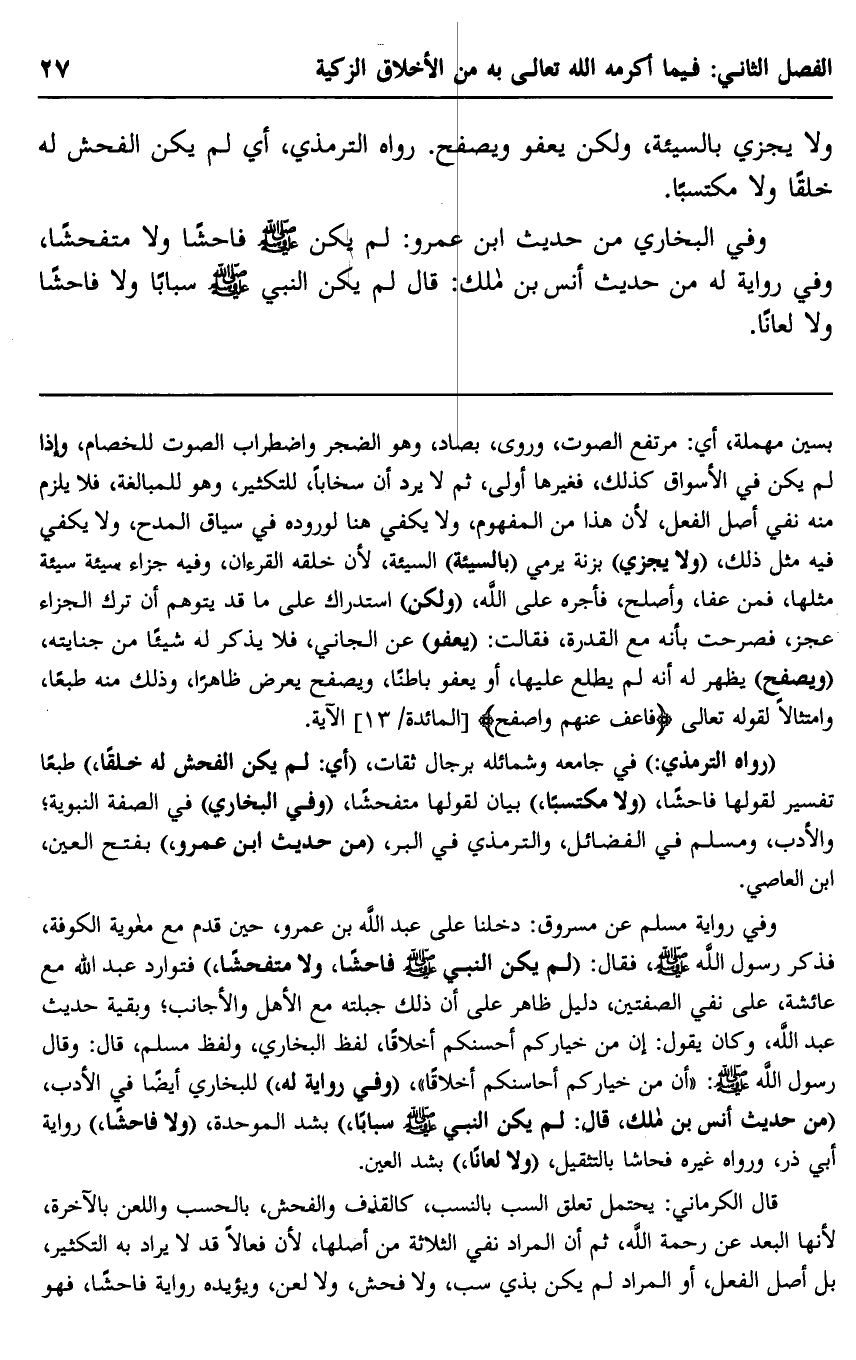 "رواه الترمذي" في جامعه وشمائله برجال ثقات، "أي: لم يكن الفحش له خلقًا" طبعًا, تفسير لقولها: فاحشًا، "ولا مكتسبًا" بيان لقولها متفحشًا، "وفي البخاري" في الصفة النبوية؛ والأدب، ومسلم في الأدب، ومسلم في الفضائل، والترمذي في البر، "من حديث ابن عمرو" -بفتح العين- ابن العاص.