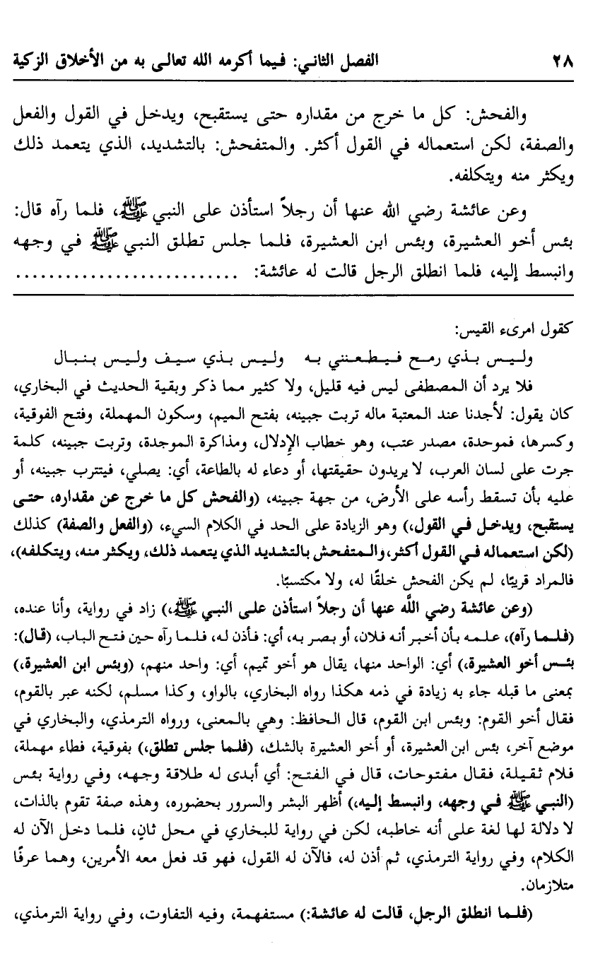 وعن عائشة -رضي الله عنها- أن رجلًا استأذن على النبي -صلى الله عليه وسلم، فلما رآه قال: بئس أخو العشيرة، وبئس ابن العشيرة، فلمَّا جلس تطلق النبي -صلى الله عليه وسلم- في وجهه وانبسط إليه، فلمَّا انطلق الرجل قالت له عائشة: