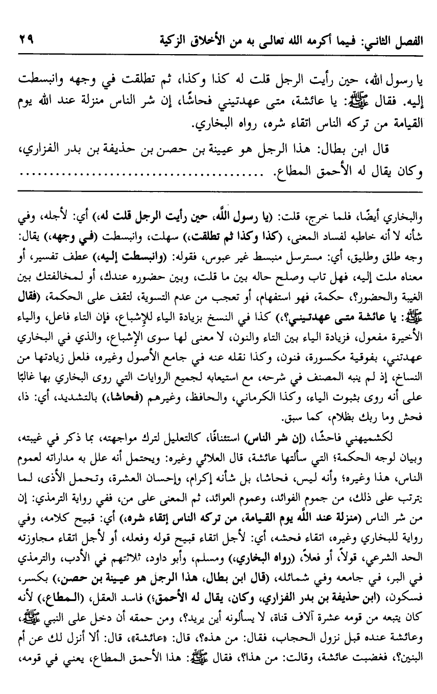 الكشميهني فاحشًا، "إن شر الناس" استئنافًا، كالتعليل لترك مواجهته، بما ذكر في غيبته، وبيان لوجه الحكمة التي سألتها عائشة، قال العلائي وغيره: ويحتمل أنه علل به مداراته لعموم الناس، وهذا وغيره؛ وأنه ليس فحاشًا، بل شأنه إكرام وإحسان العشرة، وتحمُّل الأذى لما يترتب على ذلك من جموم الفوائد، وعموم العوائد، ثم المعنى على من، ففي رواية الترمذي: "إن من شر الناس منزلة عند الله يوم القيامة، من تركه الناس اتِّقاء شره" أي: قبيح كلامه، وفي رواية للبخاري وغيره "اتقاء فحشه"، أي لأجل اتقاء قبيح قوله وفعله، أو لأجل اتقاء مجاوزته الحد الشرعي، قولًا، أو فعلًا" "رواه البخاري" ومسلم، وأبو داود، ثلاثتهم في الأدب، والترمذي في البر، في جامعه وفي شمائله، "قال ابن بطال، هذا الرجل هو عيينة بن حصن" بكسر، فسكون، "ابن حذيفة بن بدر الفزاري، وكان يقال له: الأحمق" فاسد العقل، "المطاع" لأنه كان يتبعه من قومه عشرة آلاف قناة، لا يسألونه أين يريد؟ ومن حمقه أن دخل على النبي -صلى الله عليه وسلم- وعائشة عنده قبل نزول الحجاب، فقال: من هذه؟ قال: "عائشة"، قال: ألا أنزل لك عن أم البنين؟ فغضبت عائشة، وقالت: من هذا؟ , فقال -صلى الله عليه وسلم: هذا الأحمق المطاع، يعني في قومه،