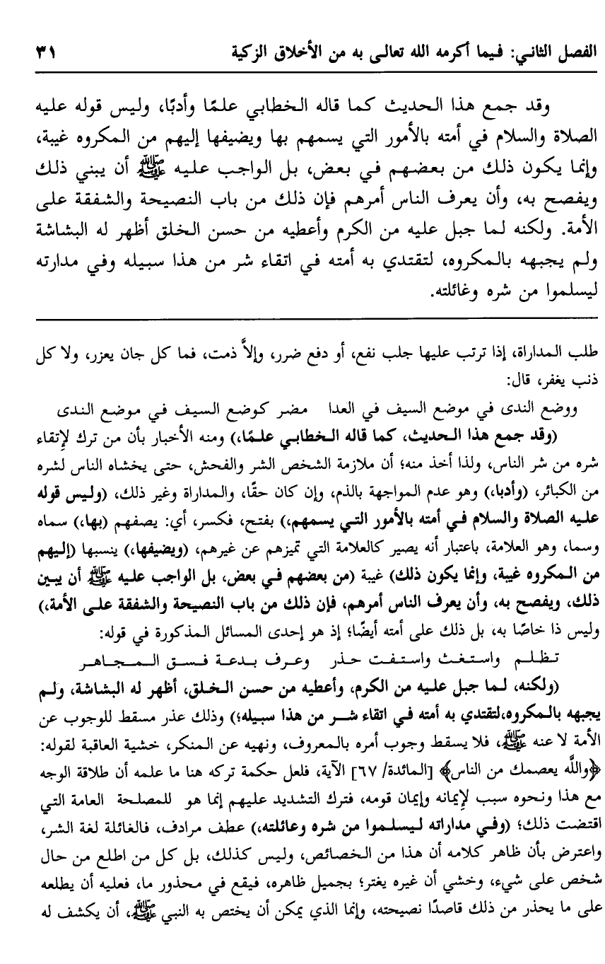 "ولكنه، لما جبل عليه من الكرم، وأعطيه من حسن الخلق، أظهر له البشاشة، ولم يجبهه بالمكروه، لتقتدي به أمته في اتقاء شر من هذا سبيله" وذلك عذر مسقط للوجوب عن الأمة لا عنه -صلى الله عليه وسلم، فلا يسقط وجوب أمره بالمعروف، ونهيه عن المنكر، خشية العاقبة لقوله: {وَاللَّهُ يَعْصِمُكَ مِنَ النَّاسِ} [المائدة: 67] الآية، فلعلَّ حكمة تركه هنا ما علمه أنَّ طلاقة الوجه مع هذا ونحوه سبب لإيمانه وإيمان قومه، فترك التشديد عليهم إنما هو للمصلحة العامة التي اقتضت ذلك؛ "وفي مداراته ليسلموا من شره وعائلته" عطف مرادف، فالغائلة لغةً الشر، واعترض بأن ظاهر كلامه أن هذا من الخصائص، وليس كذلك، بل كل من اطّلع من حال شخص على شيء، وخشي أن غيره يغتر؛ بجميل ظاهره، فيقع في محذورٍ ما، فعليه أن يطلعه على ما يحذر من ذلك قاصدًا نصيحته، وإنما الذي يمكن أن يختص به النبي -صلى الله عليه وسلم، أن يكشف له