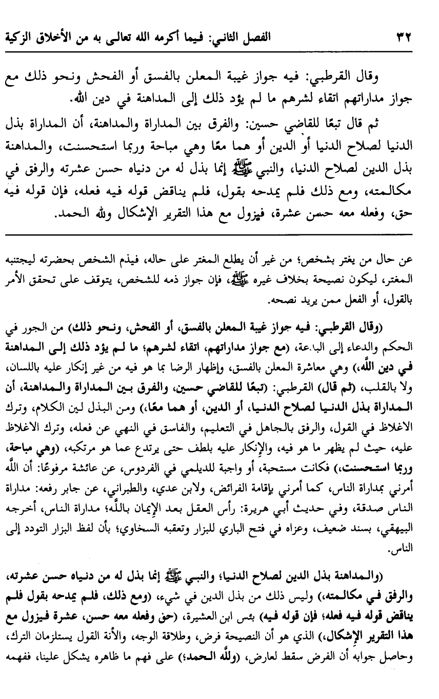 ثم قال تبعًا للقاضي حسين: والفرق بين المداراة والمداهنة، أنَّ المداراة بدل الدنيا لصلاح الدنيا أو الدين أو هما معًا, وهي مباحة وربما استحسنت، والمداهنة بذل الدين لصلاح الدنيا، والنبي -صلى الله عليه وسلم- إنما بذل له من دنياه حسن عشرته والرفق في مكالمته، ومع ذلك فلم يمدحه بقول، فلم يناقض قوله فيه فعله، فإن قوله فيه حق، وفعله معه حسن عشرة، فيزول مع هذا التقرير الإشكال ولله الحمد.