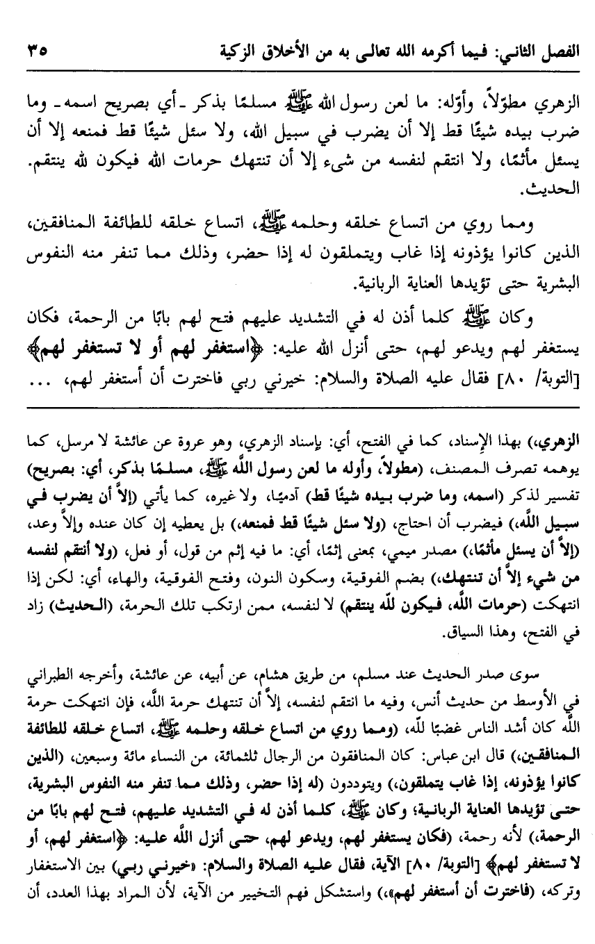 الزهري مطولًا، وأوَّله: ما لعن رسول الله -صلى الله عليه وسلم- مسلمًا بذكر -أي: بصريح اسمه- وما ضرب بيده شيئًا قط إلّا أن يضرب في سبيل الله، ولا سُئِلَ شيئًا قط فمنعه إلّا أن يسئل مأثمًا، ولا انتقم لنفسه من شيء إلا أن تُنْتَهَكَ حرمات الله فيكون لله ينتقم. الحديث.