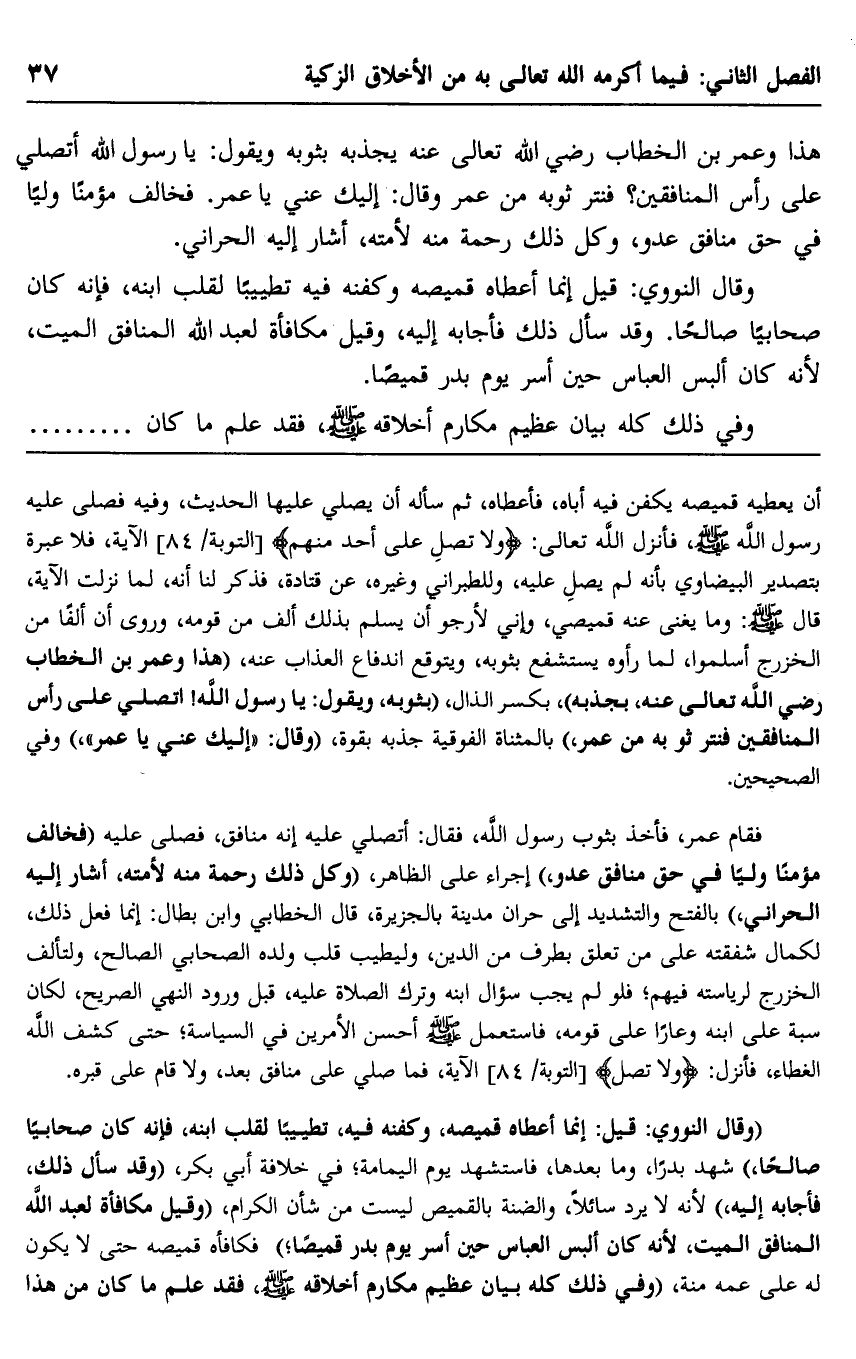 هذا وعمر بن الخطاب -رضي الله تعالى- عنه يجذبه بثوبه ويقول: يا رسول الله, أتصلي على رأس المنافقين؟ فنتر ثوبه من عمر وقال: "إليك عنِّي يا عمر". فخالف مؤمنًا وليًّا في حق منافق عدو، وكل ذلك رحمة منه لأمته، أشار إليه الحراني.