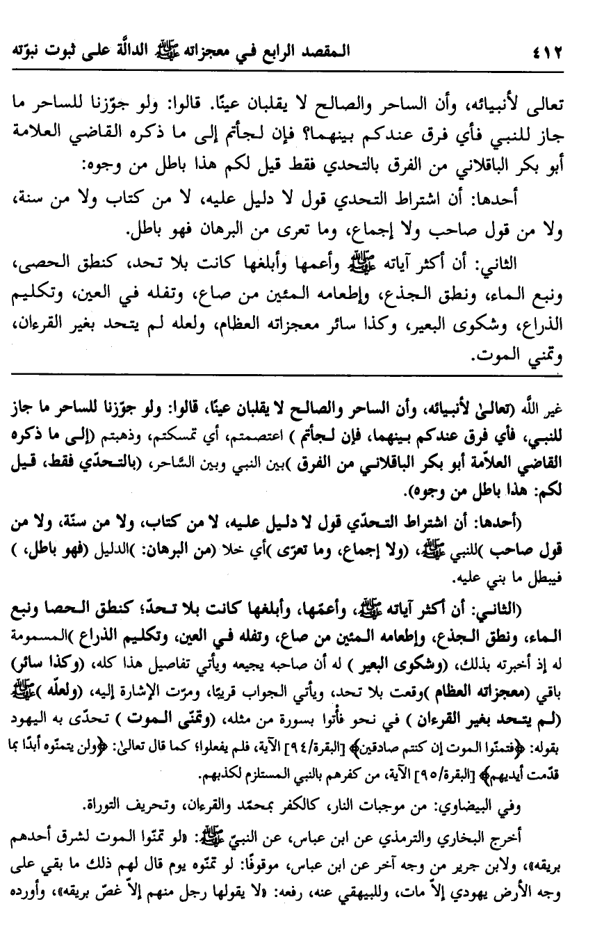 "الثاني: إن أكثر آياته -صلى الله عليه وسلم- وأعمَّها وأبلغها بلا تحدٍّ، كنطق الحصا ونبع الماء، ونطق الجذع، وإطعامه المئين من صاع، وتفله في العين، وتكليم الذراع" المسمومة له إذا أخبرته بذلك، "وشكوى البعير" له أنّ صاحبه يجيعه, ويأتي تفاصيل هذا كله، "وكذا سائر" باقي معجزاته العظام" وقعت بلا تحدٍّ، ويأتي الجواب قريبًا، ومرَّت الإشارة إليه، "ولعله" صلى الله عليه وسلم "لم يتحد بغير القرآن" في نو: {فَأْتُوا بِسُورَةٍ مِّنْ مِثْلِهِ} ، "وتمني الموت" تحدَّى به اليهود بقوله: {فَتَمَنَّوُا الْمَوْتَ إِنْ كُنْتُمْ صَادِقِينَ} [البقرة: 94] الآية، فلم يفعلوا، كما قال تعالى: {وَلَنْ يَتَمَنَّوْهُ أَبَدًا بِمَا قَدَّمَتْ أَيْدِيهِمْ} [البقرة: 95] الآية، من كفرهم بالنبي المستلزم لكذبهم.
