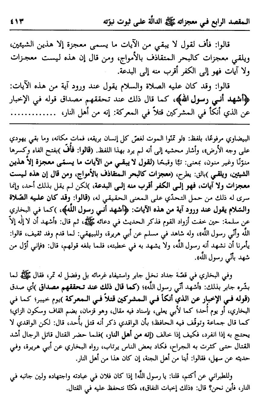 قالوا: وقد كان -عليه الصلاة والسلام- يقول عند ورود آية من هذه الآيات: "أشهد أني رسول الله"، كما قال ذلك عند تحققهم مصداق قوله في الإخبار عن الذي أنكأ في المشركين قتلًا في المعركة: إنه من أهل النار،.................................................