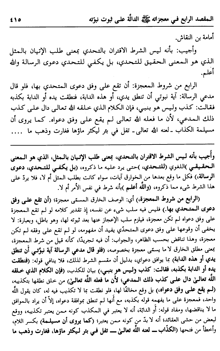 الرابع من شروط المعجزة: أن تقع على وفق دعوى المتحدي بها، فلو قال مدعي الرسالة: آية نبوتي أن تنطق يدي، أو هذه الدابة، فنطقت يده أو الدابة بكذبه فقالت: كذب وليس هو بنبي، فإن الكلام الذي خلقه الله تعالى دال على كذب ذلك المدعي؛ لأن ما فعله الله تعالى لم يقع على وفق دعواه. كما يروى أن مسيلمة الكذاب -لعنه الله تعالى - تَفَل في بئر ليكثر ماؤها فغارت وذهب ما..................