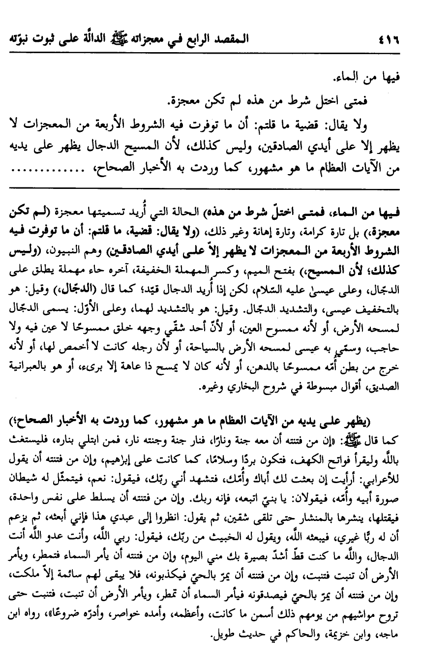 ولا يقال: قضية ما قلتم: أن ما توفرت فيه الشروط الأربعة من المعجزات لا يظهر إلّا على أيدي الصادقين، وليس كذلك، لأنَّ المسيح الدجال يظهر على يديه من الآيات العظام ما هو مشهور، كما وردت به الأخبار الصحَّاح،..........................