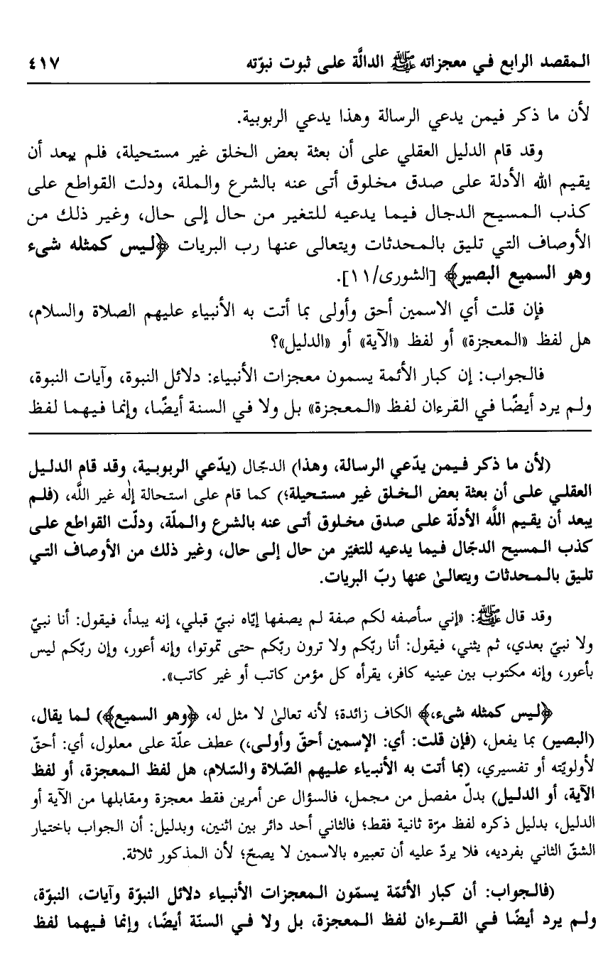 وقد قام الدليل العقلي على أن بعثة بعض الخلق غير مستحيلة، فلم يبعد أن يقيم الله الأدلة على صدق مخلوق أتى عنه بالشرع والملة، ودلت القواطع على كذب المسيح الدجال فيما يدَّعيه للتغير من حال إلى حال، وغير ذلك من الأوصاف التي تليق بالمحدثات ويتعالى عنها رب البريات {لَيْسَ كَمِثْلِهِ شَيْءٌ وَهُوَ السَّمِيعُ الْبَصِيرُ} [الشورى: 11] .