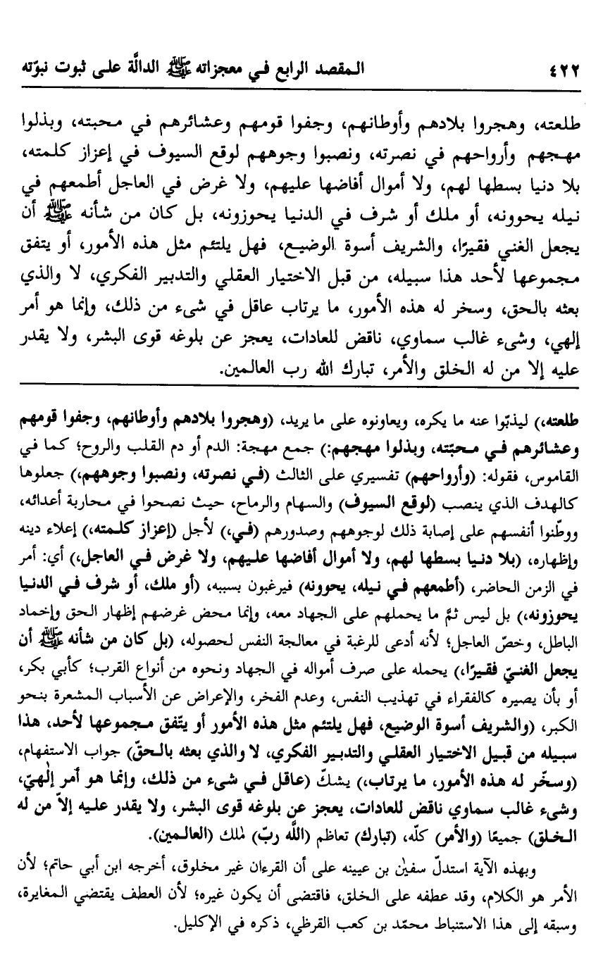 طلعته، وهجروا بلادهم وأوطانهم، وجفوا قومهم وعشائرهم في محبته، وبذلوا مهجهم وأرواحهم في نصرته، ونصبوا وجوههم لوقع السيوف في إعزاز كلمته، بلا دنيا بسطها لهم، ولا أموال أفاضها عليهم، ولا غرض في العاجل أطمعهم في نيله يحوونه، أو ملك أو شرف في الدنيا يحوزونه، بل كان من شأنه -صلى الله عليه وسلم- أن يجعل الغني فقيرًا، والشريف أسوة الوضيع، فهل يلتئم مثل هذه الأمور، أو يتفق مجموعها لأحد هذا سبيله، من قِبَل الاختيار العقلي والتدبير الفكري، لا والذي بعثه بالحق، وسخر له هذه الأمور، ما يرتاب عاقل في شيء من ذلك، وإنما هو أمر إلهي، وشيء غالب سماوي، ناقض للعادات، يعجز عن بلوغه قوى البشر، ولا يقدر عليه إلا من له الخلق والأمر، تبارك الله رب العالمين.