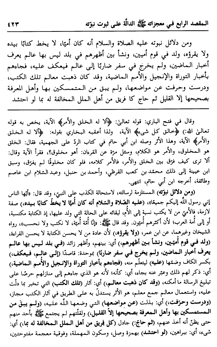 ومن دلائل نبوته -عليه الصلاة والسلام- أنه كان أميًّا، لا يخط كتابًا بيده ولا يقرؤه، ولد في قوم أميين، ونشأ بين أظهرهم في بلد ليس بها عالم يعرف أخبار الماضيين، ولم يخرج في سفر ضاربًا إلى عالم فيعكف عليه، فجاءهم بأخبار التوراة والإنجيل والأمم الماضية، وقد كان ذهبت معالم تلك الكتب، ودرست وحُرّفت عن مواضعها، ولم يبق من المتمسكين بها وأهل المعرفة بصحيحها إلّا القليل, ثم حاج كان فريق من أهل الملل المخالفة له بما لو احتشد