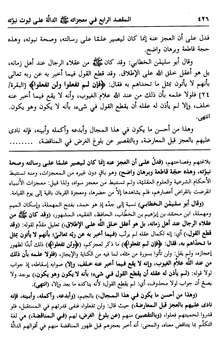 وقال أبو سليمان الخطابي: وقد كان -صلى الله عليه وسلم- من عقلاء الرجال عند أهل زمانه، بل هو أعقل خلق الله على الإطلاق، وقد قطع القول فيما أخبر به عن ربه تعالى, بأنهم لا يأتون بمثل ما تحداهم به فقال: {فَإِنْ لَمْ تَفْعَلُوا وَلَنْ تَفْعَلُوا} [البقرة: 24] فلولا علمه بأن ذلك من عند الله علَّام الغيوب، وأنه لا يقع فيما أخبر عنه خلف، وإلا لم يأذن له عقله أن يقطع القول في شيء بأنه لا يكون وهو يكون. انتهى.