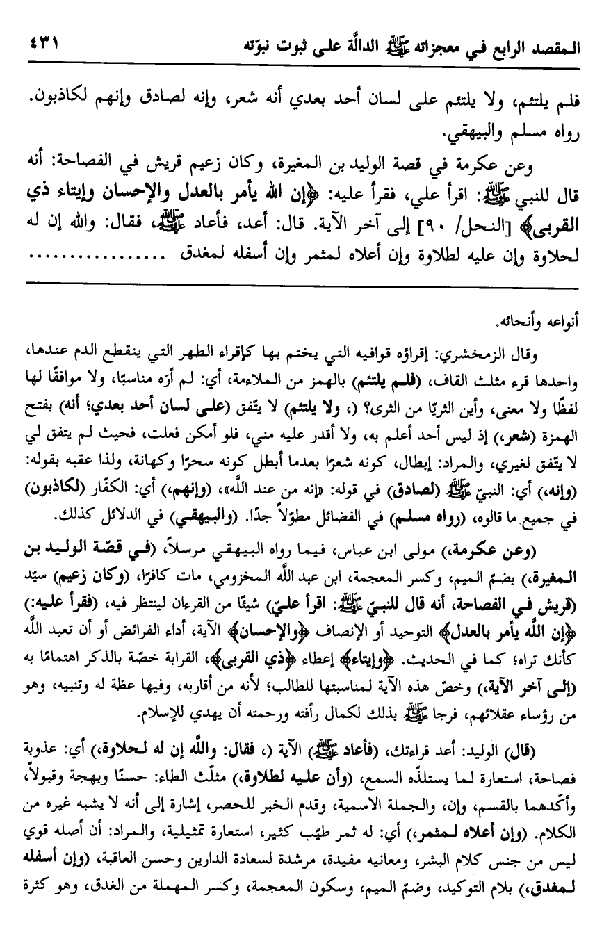 وعن عكرمة في قصة الوليد بن المغيرة، وكان زعيم قريش في الفصاحة: أنه قال للنبي -صلى الله عليه وسلم: اقرأ علي، فقرأ عليه: {إِنَّ اللَّهَ يَأْمُرُ بِالْعَدْلِ وَالْأِحْسَانِ وَإِيتَاءِ ذِي الْقُرْبَى} [النحل: 90] إلى آخر الآية. قال: أعد، فأعاد -صلى الله عليه وسلم، فقال: والله إن له لحلاوة, وإن عليه لطلاوة, وإن أعلاه لمثمر, وإن أسفله لمغدق.....................