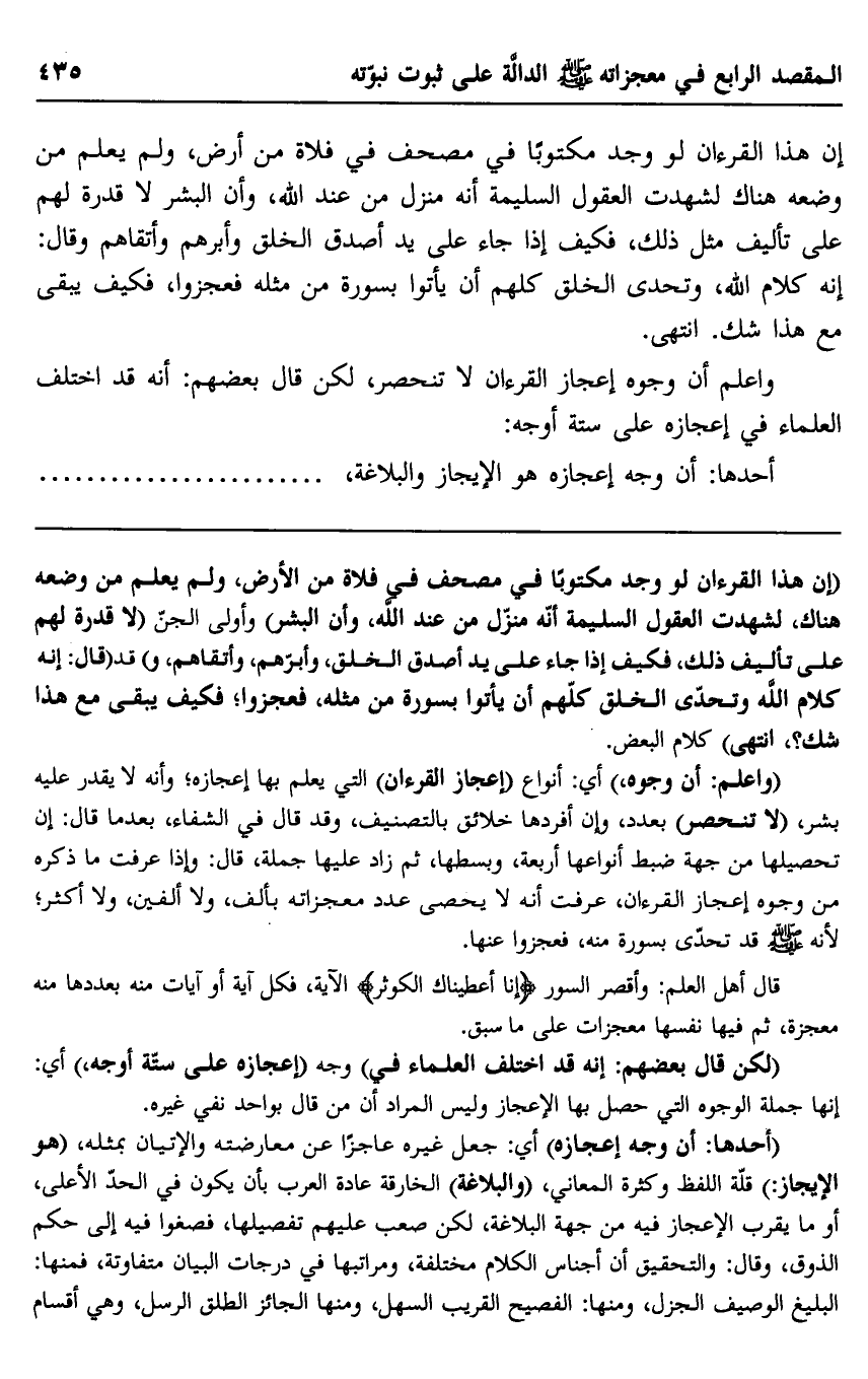 "واعلم أنَّ وجوه" أي: أنواع "إعجاز القرآن" التي يعلم بها إعجازه، وأنه لا يقدر عليه بشر، "لا تنحصر" بعدد, وإن أفردها خلائق بالتصنيف، وقد قال في الشفاء، بعدما قال: إن تحصيلها من جهة ضبط أنواعها أربعة، وبسطها، ثم زاد عليها جملة، قال: وإذا عرفت ما ذكره من وجوه إعجاز القرآن، عرفت أنه لا يحصى عدد معجزات بألفٍ ولا ألفين، ولا أكثر؛ لأنه -صلى الله عليه وسلم- قد تحدَّى بسورة منه، فعجزوا عنها.