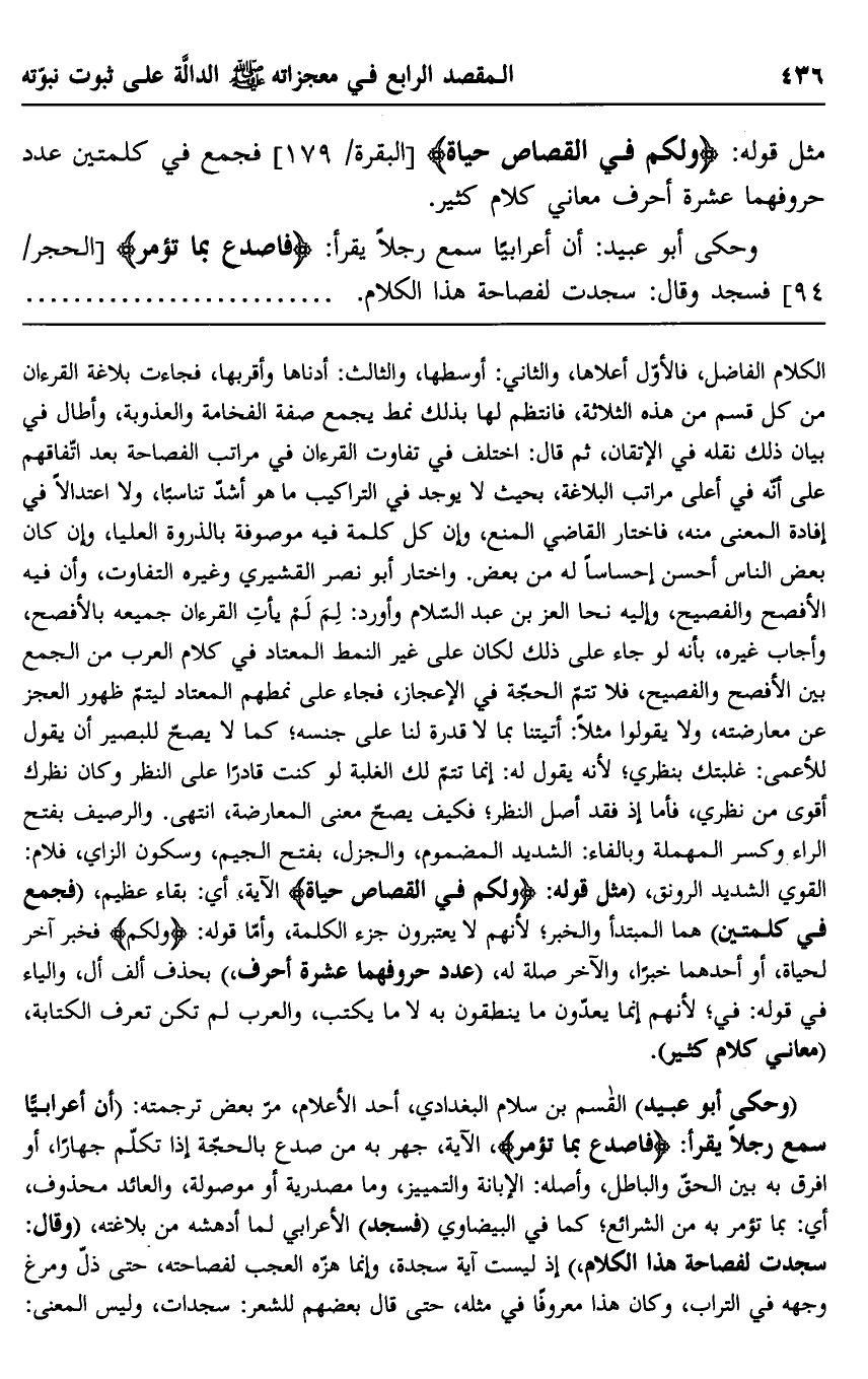"وحكى أبو عبيد" القاسم بن سلام البغدادي أحد الأعلام، مَرَّ بعض ترجمته، "أن أعرابيًّا سمع رجلًا يقرأ: {فَاصْدَعْ بِمَا تُؤْمَرُ} الآية. جهر به من صدع بالحجة إذا تكلم جهارًا، أو افرق به بين الحق والباطل، وأصله: الإبانة والتمييز، وما مصدرية أو موصولة, والعائد محذوف, أي: بما تؤمر به من الشرائع، كما في البيضاوي "فسجد" الأعرابي لما أدهشه من بلاغته، "وقال: سجدت لفصاحة هذا الكلام"؛ إذ ليست آية سجدة، وإنما هزَّه العجب لفصاحته، حتى ذلَّ ومرَّغ وجهه في التراب، وكان هذا معروفًا في مثله، حتى قال بعضهم للشعر، سجدات وليس المعنى: