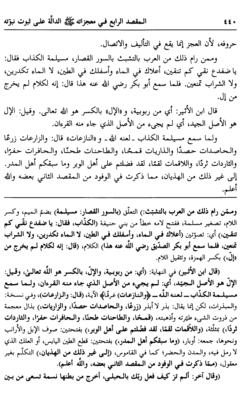 "قال ابن الأثير" في النهاية: "أي: من ربوبية، والإلّ، بالكسر هو الله تعالى، وقيل: الإلّ هو الأصل الجيد، أي: لم يجئ من الأصل الذي جاء منه القرآن، ولما سمع مسيلمة الكذاب -لعنه الله- {وَالنَّازِعَاتِ غَرْقًا} الآية. "قال: والزارعات" بذال معجمة من ذروت الشيء طيرته وأذهبته، "قمحًا، والطاحنات طحنًا، والحافرات حفرًا، والثاردات ثردًا" بمثلثة، "واللاقمات لقمًا، لقد فضلتم على أهل الوبر" بفتحتين، صوف الإبل والأرانب ونحوها، جمعه: أوبار، "وما سبقكم أهل المدر" بفتحتين: قطع الطين اليابس، أو العلك الذي لا رمل فيه، والمدن والحضر، كما في القاموس، "إلى غير ذلك من الهذيان،" التكلم بغير معقول، "مما ذكرت في الوفود من المقصد الثاني بعضه والله أعلم".