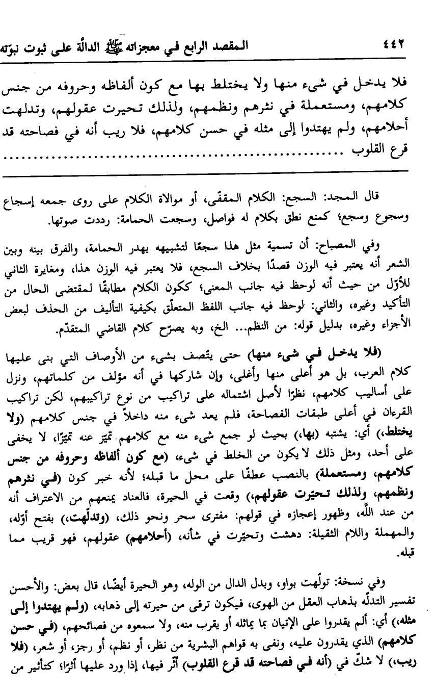 فلا يدخل في شيء منها, ولا يختلط بها, مع كون ألفاظه وحروفه من جنس كلامهم، ومستعملة في نثرهم ونظمهم، ولذلك تحيَّرت عقولهم، وتدلهت أحلامهم, ولم يهتدوا إلى مثله في حسن كلامهم، فلا ريب أنه في فصاحته قد قرع القلوب..........................