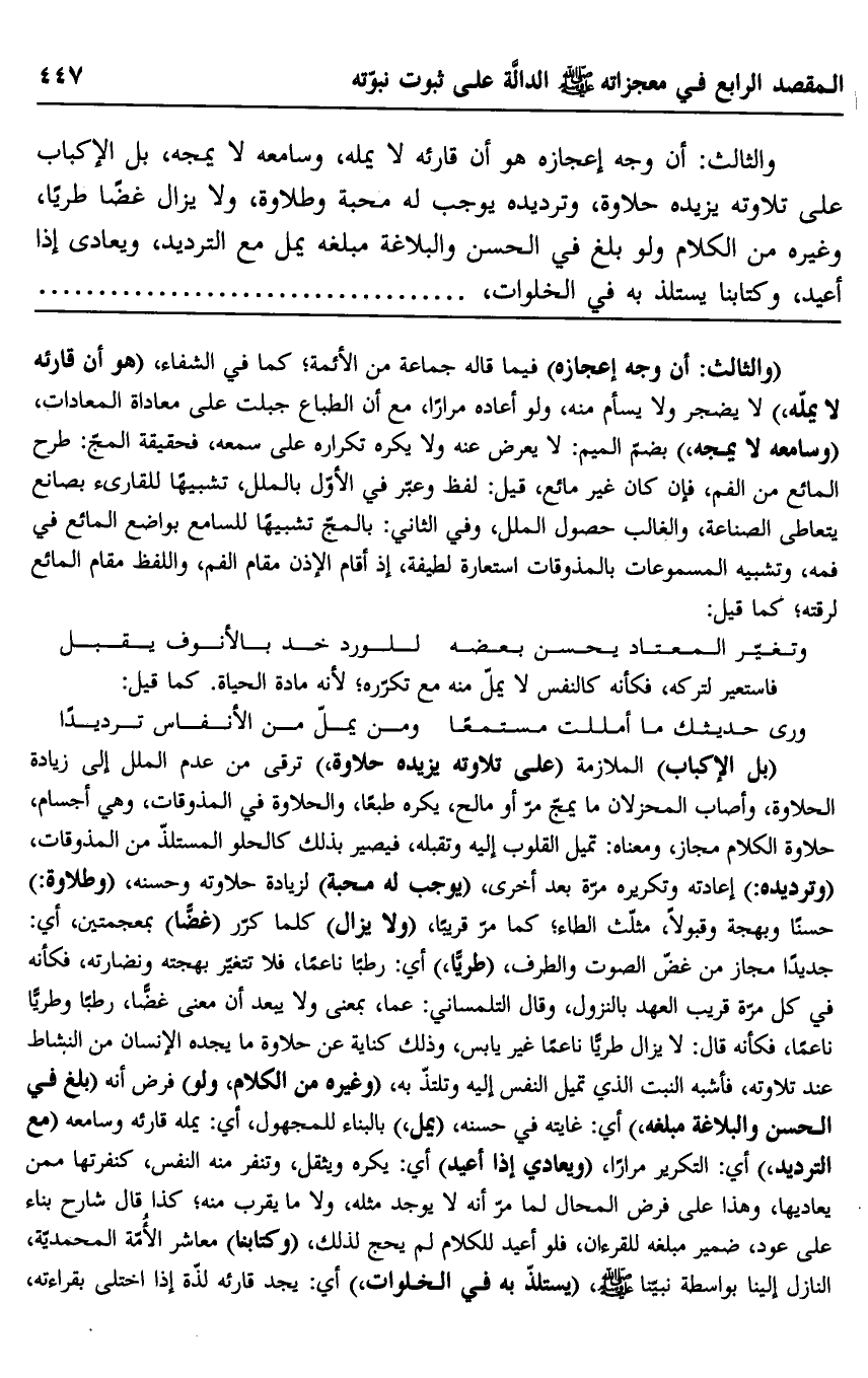 "والثالث: إن وجه إعجازه" فيما قاله جماعة من الأئمة، كما في الشفاء، "هو أن قارئه لا يمله" لا يضجر ولا يسأم منه، ولو أعاده مرارًا، مع أن الطباع جبلت على معاداة المعادات، "وسامعه لا يمجه" بضم الميم: لا يعرض عنه ولا يكره تكراره على سمعه, فحقيقة المج: طرح المائع من الفم، فإن كان غير مائع، قيل: لفَظ, وعبَّر في الأول بالملل تشبيهًا للقارئ بصانع يتعاطى الصناعة، والغالب حصول الملل، وفي الثاني بالمج تشبيهًا للسامع بواضع المائع في فمه، وتشبيه المسموعات بالمذوقات استعارة لطيفة؛ إذ أقام الإذن مقام الفم، واللفظ مقام المائع لرقته، كما قيل: