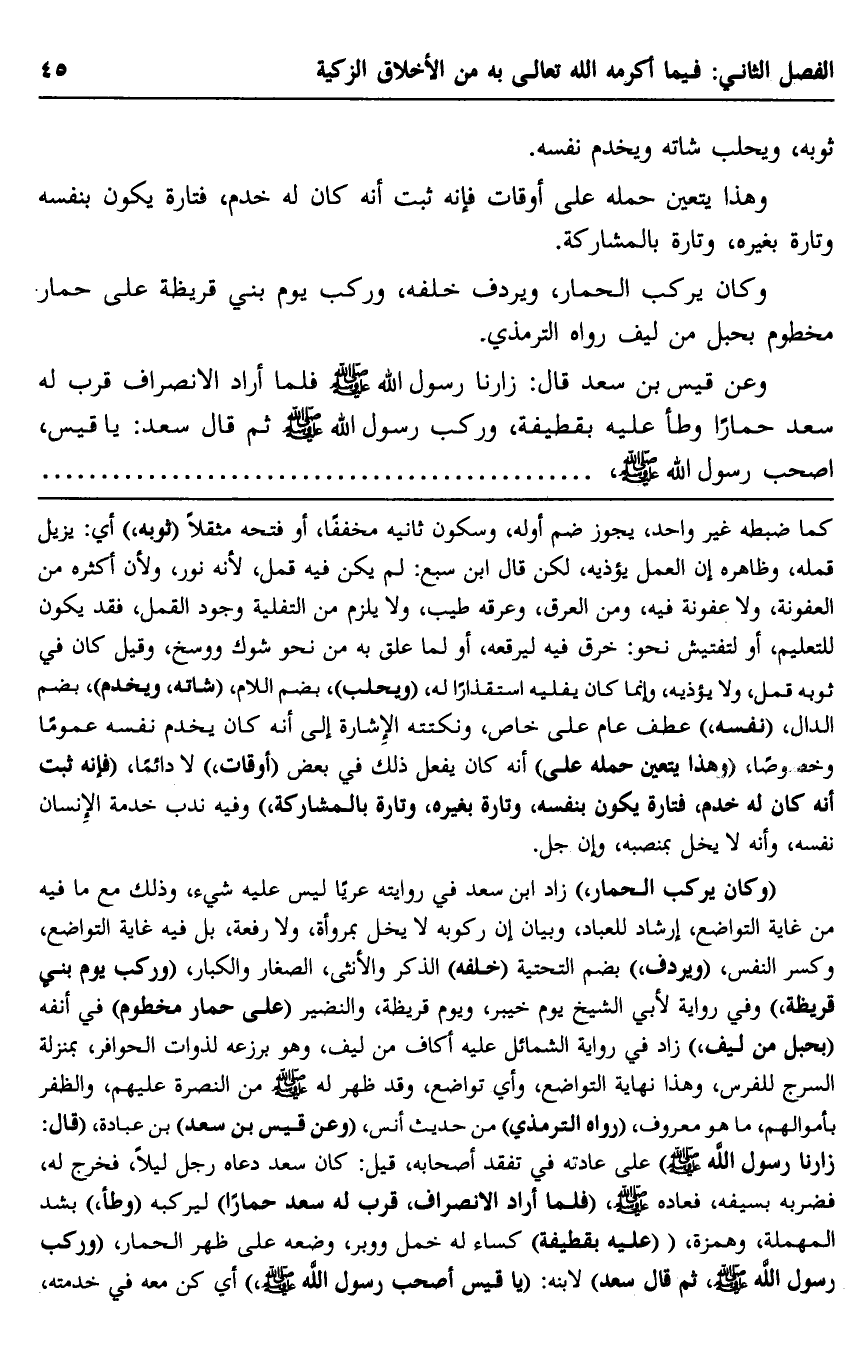 "وكان يركب الحمار" زاد ابن سعد في روايته عريًا ليس عليه شيء، وذلك مع ما فيه من غاية التواضع، إرشاد للعباد، وبيان أن ركوبه لا يخل بمروءة، ولا رفعة، بل ف غاية التواضع، وكسر النفس، "ويردف" بضم التحتية "خلفه" الذكر والأنثى، الصغار والكبار، "وركب يوم بني قريظة" وفي رواية لأبي الشيخ يوم خيبر، ويوم قريظة، والنضير "على حمار مخطوم" في أنفه "بحبل من ليف" زاد في رواية الشمائل: عليه أكاف من ليف، وهو برزعه لذوات الحوافر، بمنزلة السرج للفرس، وهذا نهاية التواضع، وأي تواضع، وقد ظهر له -صلى الله عليه وسلم- من النصرة عليهم، والضفر بأموالهم، ما هو معروف، "رواه الترمذي" من حديث أنس، "وعن قيس بن سعد" بن عبادة، "قال: زارنا رسول الله -صلى الله عليه وسلم" على عادته في تفقد أصحابه، قيل: كان سعد دعاه رجل ليلًا، فخرج له، فضربه بسيفه، فعاده -صلى الله عليه وسلم، "فلما أراد الانصراف، قرَّب له سعد حمارا" ليركبه "وطأ" بشد المهملة، وهمزة، "عليه بقطيفة" كساء له خمل ووبر، وضعه على ظهر الحمار، "وركب رسول الله -صلى الله عليه وسلم، ثم قال سعد" لابنه: "يا قيس, اصحب رسول الله -صلى الله عليه وسلم" أي: كن معه في خدمته،