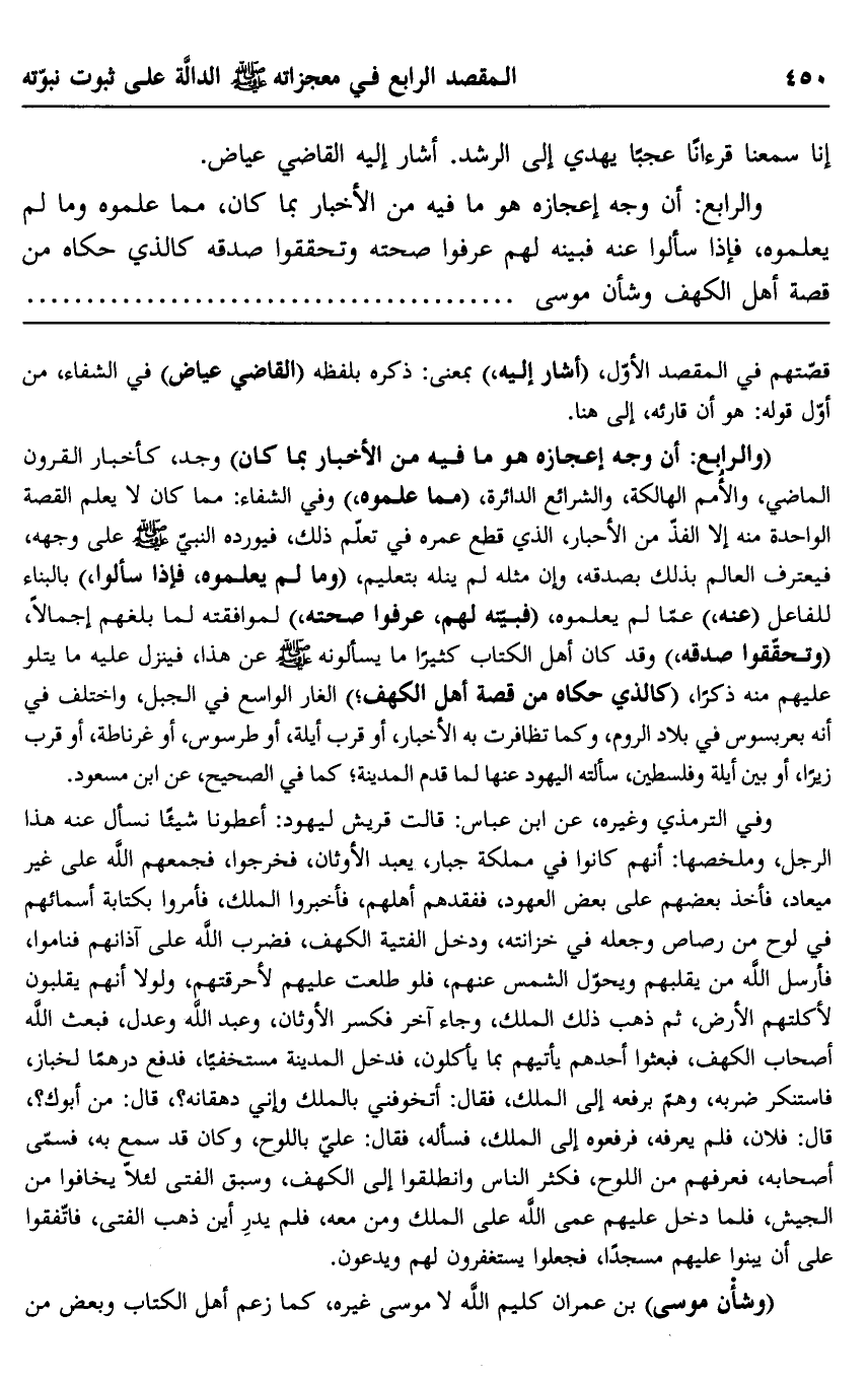 "والرابع: إن وجه إعجازه هو ما فيه من الأخبار بما كان" وجد، كأخبار القرون الماضي والأمم الهالكة، والشرائع الدائرة، "مما علموه، وفي الشفاء مما كان لا يعلم القصة الواحدة منه إلا الفذ من الأحبار، الذي قطع عمره في تعلم ذلك، فيورده النبي -صلى الله عليه وسلم- على وجهه، فيعترف العالم بذلك بصدقه، وإن مثله لم ينله بتعليم، "وما لم يعلموه، فإذا سألوا" بالبناء للفاعل "عنه" عمَّا لم يعلموه، "فبينه لهم، عرفوا صحته" لموافقته لما بلغهم إجمالًا، "وتحققوا صدقه", وقد كان أهل الكتاب كثيرًا ما يسألونه -صلى الله عليه وسلم- عن هذا فينزل عليه ما يتلو عليهم منه ذكرًا، "كالذي حكاه من قصة أهل الكهف،" الغار الواسع في الجبل، واختلف في أنه بعربسوس في بلاد الروم، وكما تظافرت به الأخبار، أو قرب أيلة، أو طرسوس، أو غرناطة، أو قرب زيرا، أو بين أيلة وفلسطين، سألته اليهود عنها لما قدم المدينة، كما في الصحيح، عن ابن مسعود.