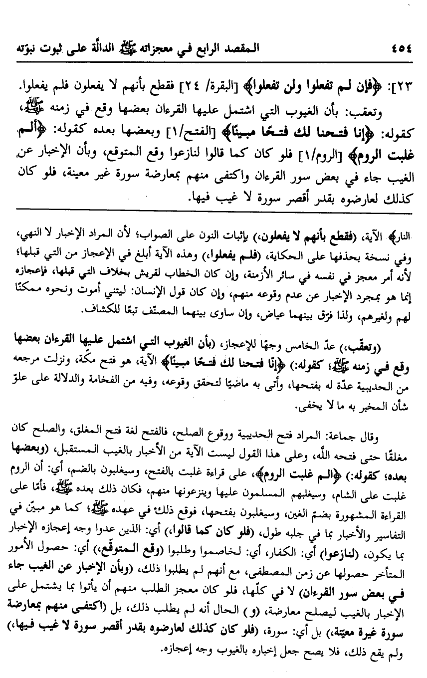 23] {فَإِنْ لَمْ تَفْعَلُوا وَلَنْ تَفْعَلُوا} [البقرة: 24] فقطع بأنهم لا يفعلون فلم يفعلوا. وتعقَّب بأن الغيوب التي اشتمل عليها القرآن بعضها وقع في زمنه -صلى الله عليه وسلم، كقوله: {إِنَّا فَتَحْنَا لَكَ فَتْحًا مُبِينًا} [الفتح: 1] وبعضها بعده كقوله: {الم, غُلِبَتِ الرُّومُ} [الروم: 1, 2] فلو كما قالوا لنازعوا وقع المتوقع، وبأن الإخبار عن الغيب جاء في بعض سور القرآن, واكتفى منهم بمعارضة سورة غير معينة، فلو كان كذلك لعارضوه بقدر أقصر سورة لا غيب فيها.